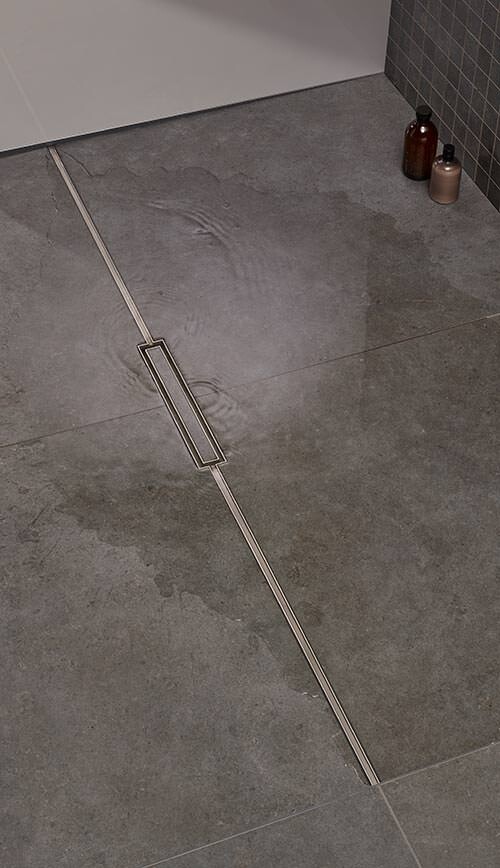 ... ist eine kompakte, kurze Duschrinne, die in der Fläche platziert wird. Lediglich ein Rechteck mit den Maßen 300 x 50 mm ist sichtbar. Die Kurzinne bietet den idealen Rahmen für eine minimale Abdeckung.