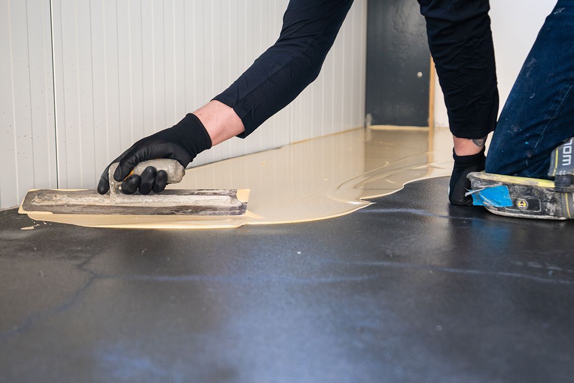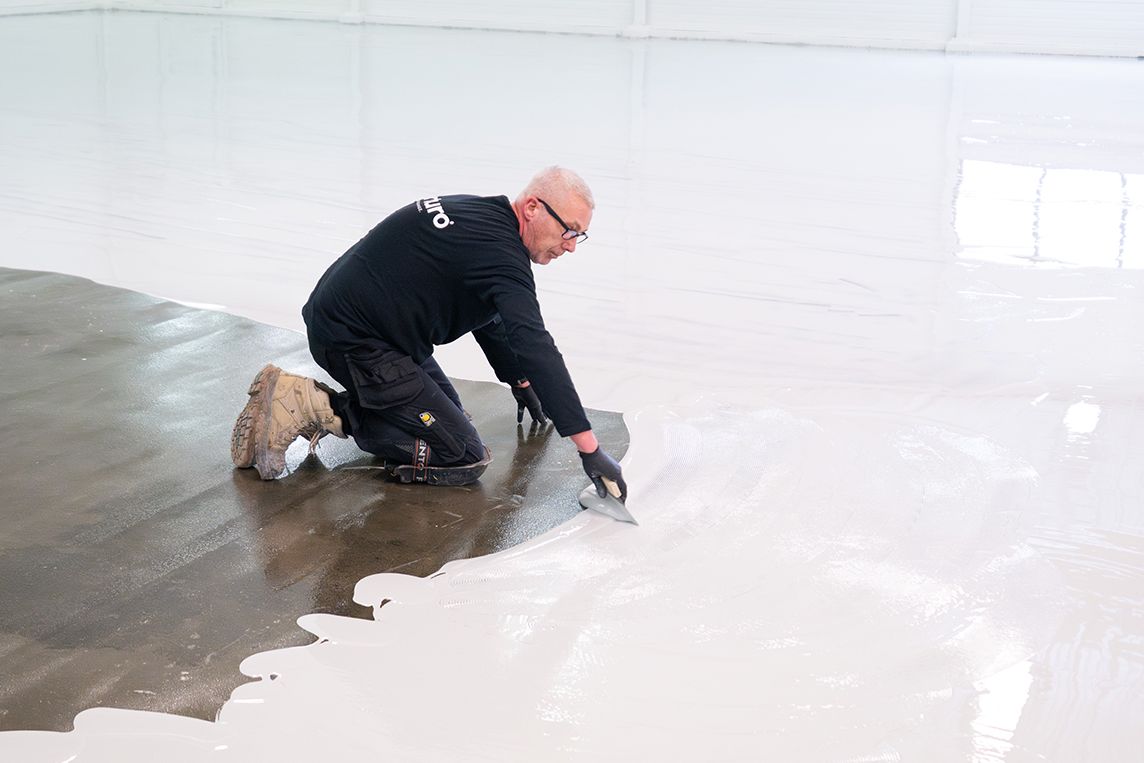 Die Beschichtung ist selbstverlaufend und selbstlüftend, sodass kein Nachrollen erforderlich ist. Sie bildet eine pflegeleichte, staubfreie Oberfläche mit Rutschhemmung, Chemikalienbeständigkeit und Flüssigkeitsdichtheit.