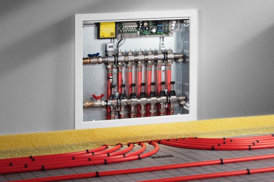 Um regenerative Energien bei niedrigen Vorlauftemperaturen optimal zu nutzen, bietet Viega die „Fonterra”-Flächentemperiersysteme an. Mit dem Noppenplattensystem „Fonterra Base” oder dem für Sanierungen entwickelten System „Fonterra Reno” lassen sich die Vorlauftemperaturen auf rund 35 °C absenken. Die Strahlungswärme ermöglicht eine Reduktion der Raumtemperatur um etwa ein bis zwei Kelvin. Die intelligenten Einzelraumregelungen „Fonterra Smart Control” und „Fonterra Heat Control” tragen nach Bestandssanierungen ohne großen Aufwand zur Energieeinsparung bei. Die nachrüstbaren Regelungen stellen durch einen automatischen hydraulischen Abgleich die gleichmäßige Versorgung aller Räume bzw. Heizkreise sicher.