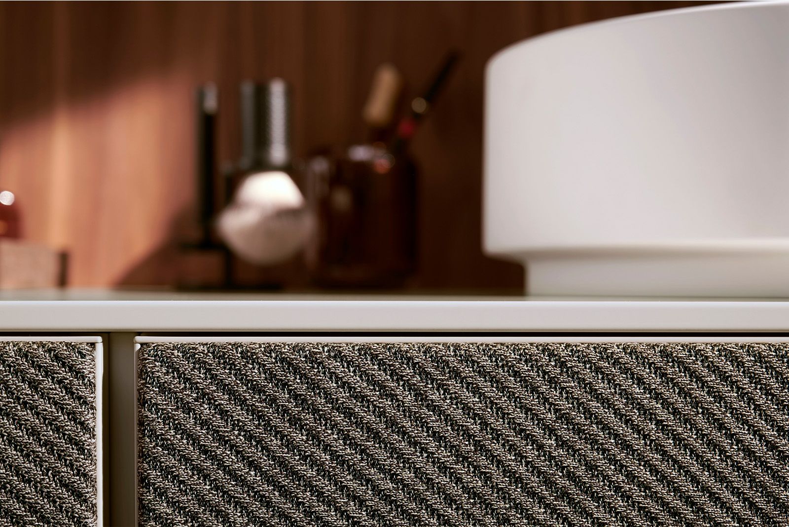 Eine Besonderheit der Xevolos E sind Fronten aus Polyestergarnen. Sie bringen textile Optik und Haptik in das Badezimmer und zeichnen sich durch Abriebfestigkeit, Farbbeständigkeit gegenüber indirekter UV-Strahlung und eine hohe Widerstandsfähigkeit aus. Flecken durch Zahnpasta, Cremes oder Haargel lassen sich mit Seifenwasser entfernen. Alternativ stehen Oberflächen in Holzdekor, Glas oder Keramik zur Verfügung.