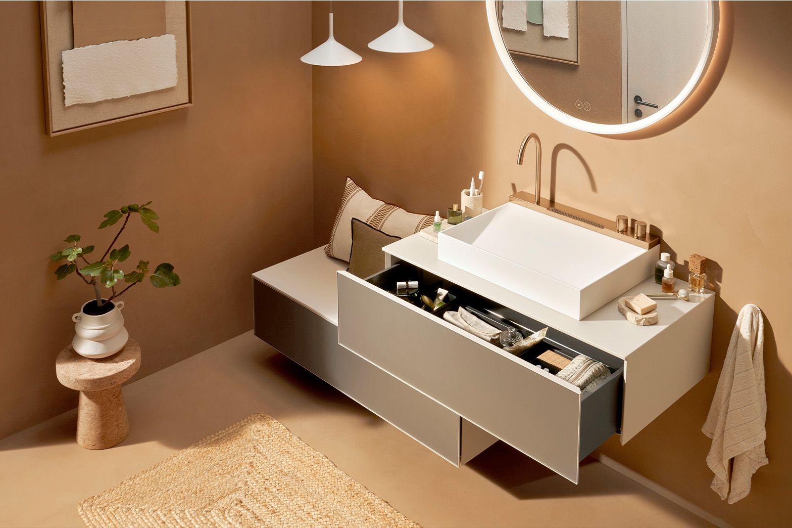 Neben verschiedenen Oberflächen bietet die Serie eine breite Auswahl an Korpus- und Konsolenfarben, darunter Mattweiß, Sandbeige Matt und Schiefergrau Matt. Unterschiedliche Größen und Kombinationen ermöglichen flexible Raumkonzepte. Beispiele sind schwebende Unterschränke oder Kombinationen mit Sideboards, die als Sitzgelegenheit, Stauraum oder dekoratives Element dienen können.