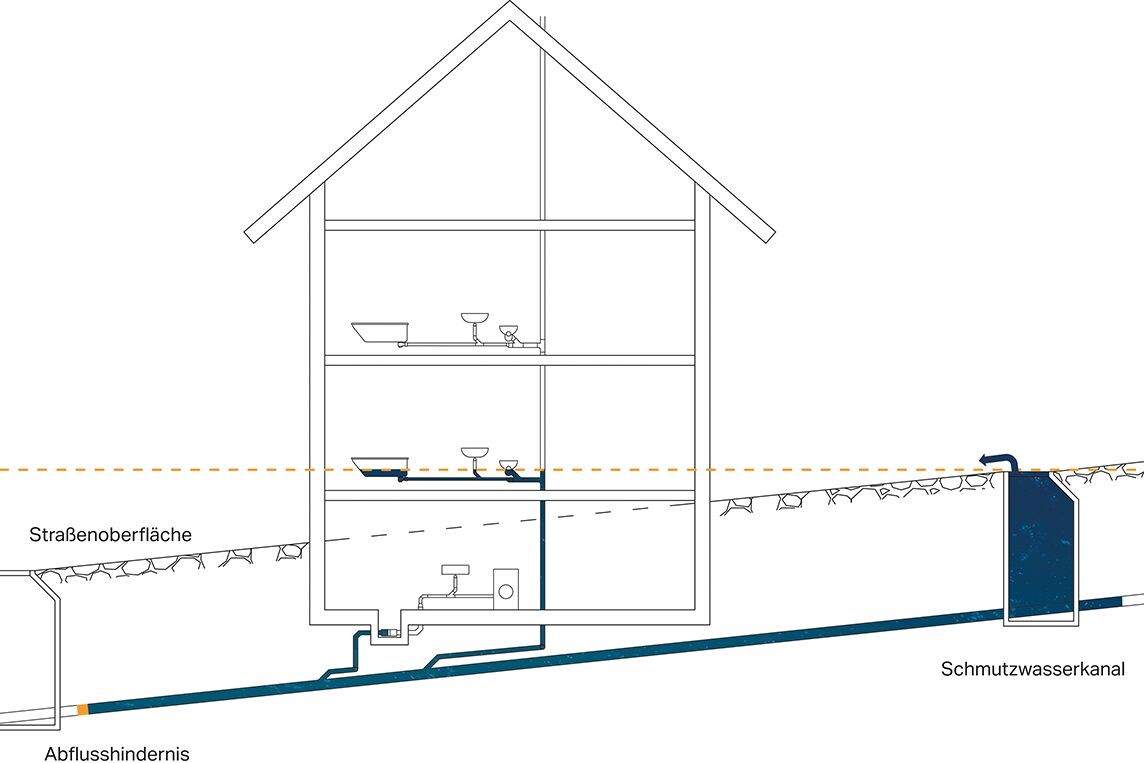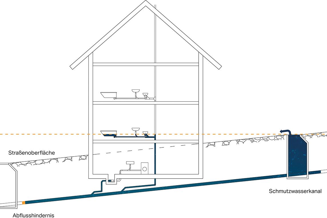 - Notentwässerung: In dicht bebauten Gebieten darf die Notentwässerung unter Auflagen auch auf öffentliche oder benachbarte Grundstücke geführt werden.