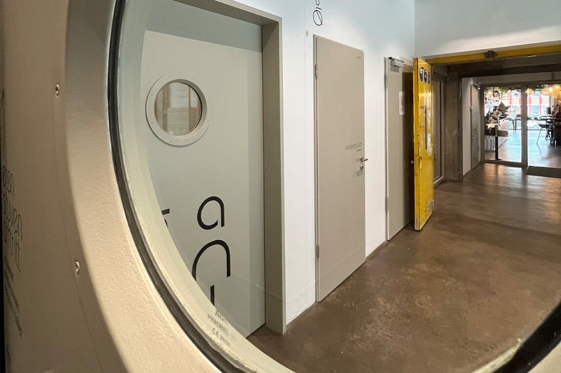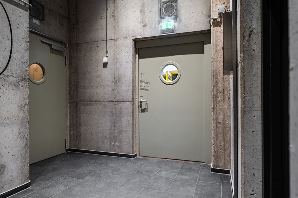 Im Einzelfall wurden daher Alternativen gefunden, die von der Norm abweichen konnten. Im ehemaligen Silo bestand die passende Lösung in einer Zargenverbreiterung: Fast alle Türen wurden als Mischzargen ausgeführt – mit Blockzargen auf der Bandseite und Eckzargen auf der Schlossseite.