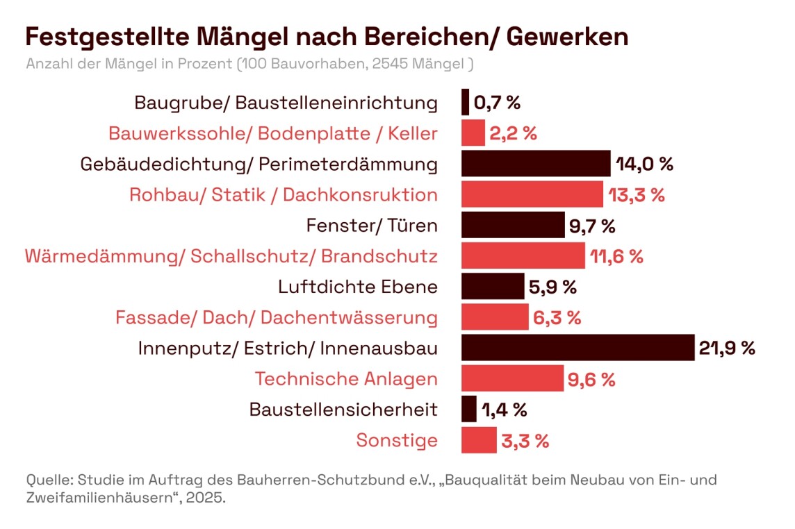 (20.10.2025) Das Mängelaufkommen beim privaten Neubau von Ein- und Zweifamilienhäusern bleibt auf hohem Niveau. Das zeigt die Studie zur Bauqualität des Bauherren-Schutzbund e.V. (BSB) in Kooperation mit dem Institut für Bauforschung e.V. (IFB). Rund 700 baubegleitende Qualitätskontrollen, die der BSB an 100 exemplarischen Bauvorhaben in den Jahren 2020 bis 2024 durchführte, wurden dazu analysiert. Im Durchschnitt traten während der Bauphase rund 25 Mängel pro Projekt auf. Im Rahmen der Schlussabnahme kamen 6 Mängel dazu, sodass sich insgesamt 31 Mängel pro Bauvorhaben ergeben (2019 insgesamt 29 Mängel).