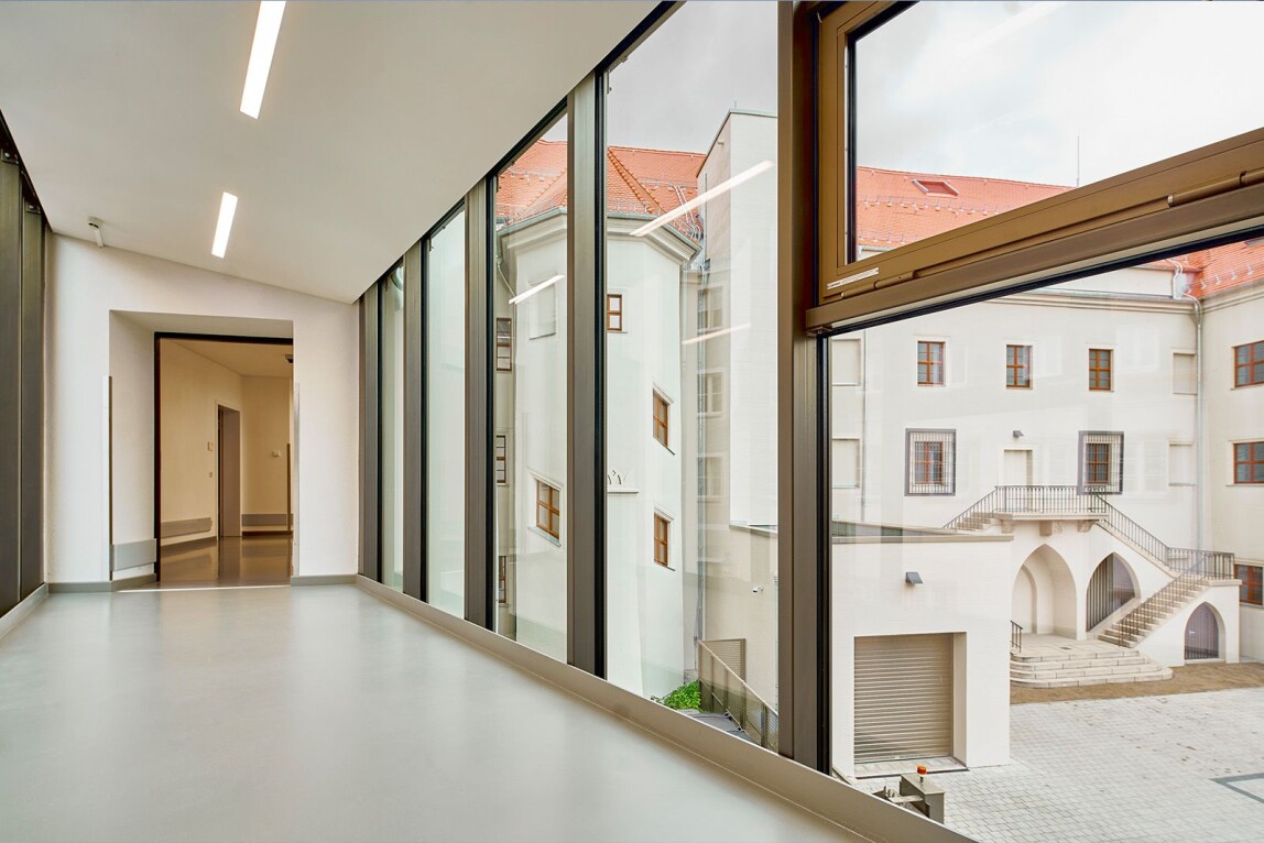 Neben zahlreichen Maßnahmen zur Substanzerhaltung des Bestandsbaus mussten alle vorhandenen Decken durch Stahlbetondecken ersetzt werden, um die zu erwartenden hohen Verkehrslasten aufnehmen zu können. Für die Magazinbereiche war eine zusätzliche Bohrpfahlgründung und die Ableitung der hohen Verkehrslasten der Decken über eine neue Stützen- Riegel-Konstruktion entlang der Außenwände erforderlich.