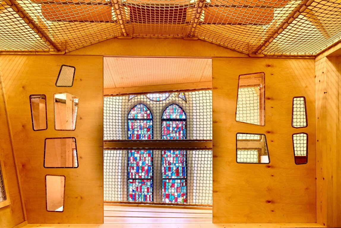 Das Konzept wurde mit maßgefertigten Woopies Light umgesetzt, deren Formensprache von Hundertwasser inspiriert ist. Jedes Paneel wurde als Unikat gestaltet und fugenlos in Möblierung, Rückzugsinseln und Einbauten integriert. Ein Wandmotiv mit Kindersilhouette trägt etwa einen akustisch wirksamen „Schulranzen” als Teil des Designs. So bleibt der Charakter der Kapelle erhalten, während die Akustik an die neue Nutzung angepasst wurde.