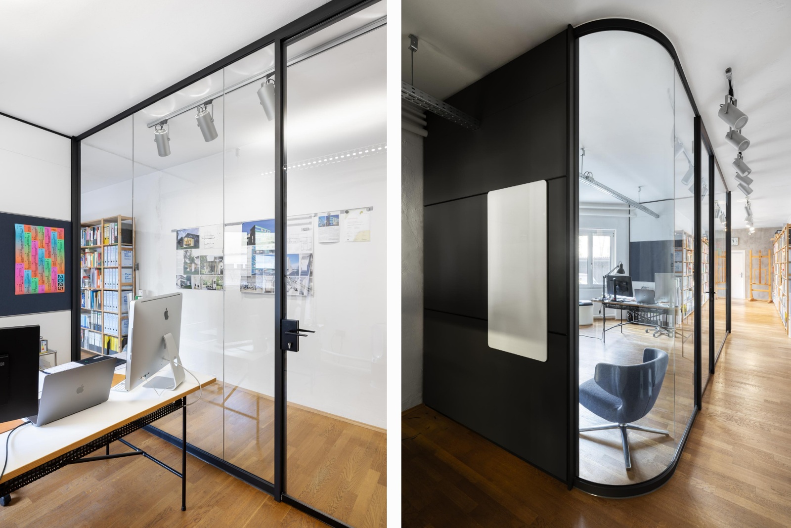 Im tiefen, zur Straße hin geöffneten Grundriss trennt eine gebogene Nurglaswand des Typs Fecoplan den Arbeitsbereich des Bürogründers vom Besprechungsraum. Die Verglasung gewährleistet akustische Abschirmung, ohne die gewünschte Offenheit und Lichtdurchlässigkeit einzuschränken. Ergänzend strukturieren Vollwände des Systems Fecowand die Arbeitsplätze. Integrierte Fecoorga-Profile ermöglichen es, Regalböden, Haken oder pinnbare Filzelemente werkzeuglos einzuhängen und bei Bedarf neu zu positionieren.