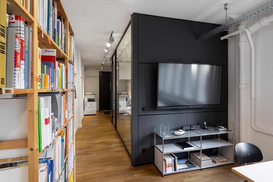 Das Farbkonzept setzt auf weiße Flächen zur Lichtreflexion und auf klare Kontraste: Profile und Zargen wurden in RAL 7021 (Schwarzgrau) ausgeführt, Türbeschläge und FSB-Drücker in RAL 9005 (Tiefschwarz). Heizrohre und Kabeltrassen sind präzise integriert, sodass der ruhige Gesamteindruck nicht gestört wird.