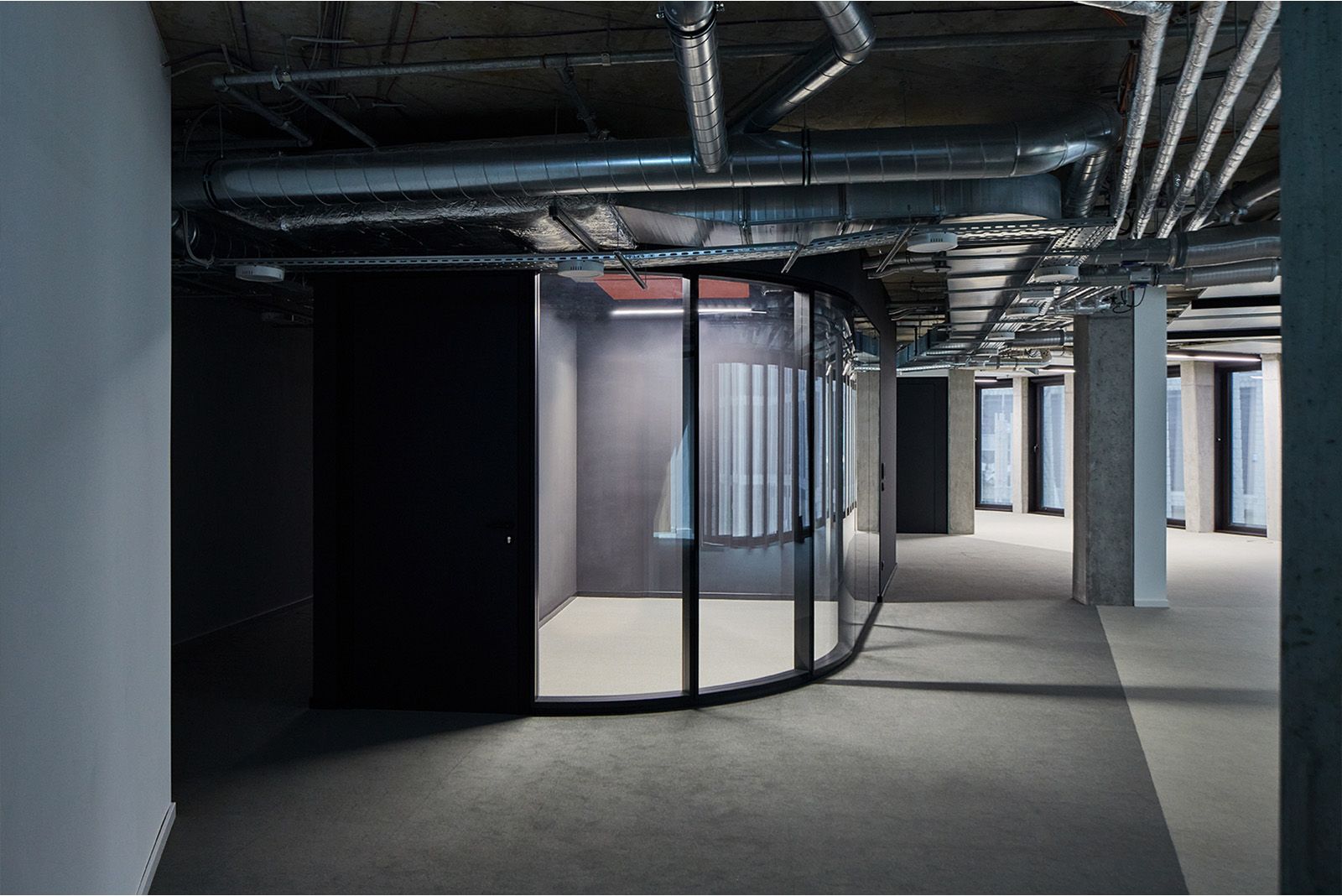 Die Glaswände wurden mit gebogenen Elementen (Radius 2.000 mm) und Ganz-Glas-Ecken kombiniert, um Offenheit und Interieurgestaltung zu unterstützen. Schwarze Profile bilden Kontraste zu Holzoberflächen und Möblierung. Insgesamt wurden über 850 m Glaswand und 230 Türen eingebaut. Die Fertigung erfolgte im Strähle-Werk Borkheide (Brandenburg), was kurze Transportwege und eine ressourcenschonende Logistik ermöglichte.