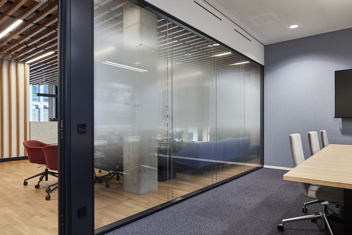 Für Mietbereiche, in denen Transparenz und Schallschutz zugleich erforderlich sind, wurde das doppelt verglaste System 3500 von Strähle eingesetzt. Raumhohe Ganzglas-Elemente ohne Vertikalpfosten sorgen für Lichtdurchflutung der Flure und Besprechungsräume. In Konferenzräumen und Rückzugsbereichen kam das Structural Glazing System 2300 zum Einsatz, teils als F30-Brandschutzwand. Folierungen im Corporate Design gewährleisten Diskretion. Durch die von Anfang an auf einfache Demontage und Umbaubarkeit bedachte Konstruktion sind die Systemwände wiederverwendbar und laut Unternehmen über Jahrzehnte nutzbar.