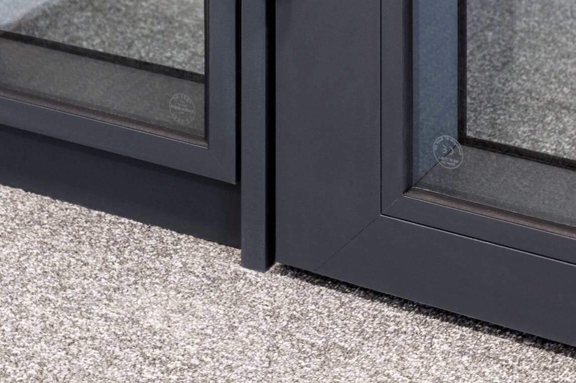 Der umlaufende Türblattrahmen kann wahlweise in Aluminium Natur EV1 eloxiert oder in einem gängigen RAL-Farbton pulverbeschichtet geliefert werden. Die zugehörige Aluminium-Türzarge besitzt bandseitig nur 18 mm und flurseitig 50 mm Spiegelbreite und verbindet das Türelement gestalterisch mit der wandbündigen Doppelverglasung Fecofix sowie anderen Feco-Systemwänden in 105 mm Wandstärke.