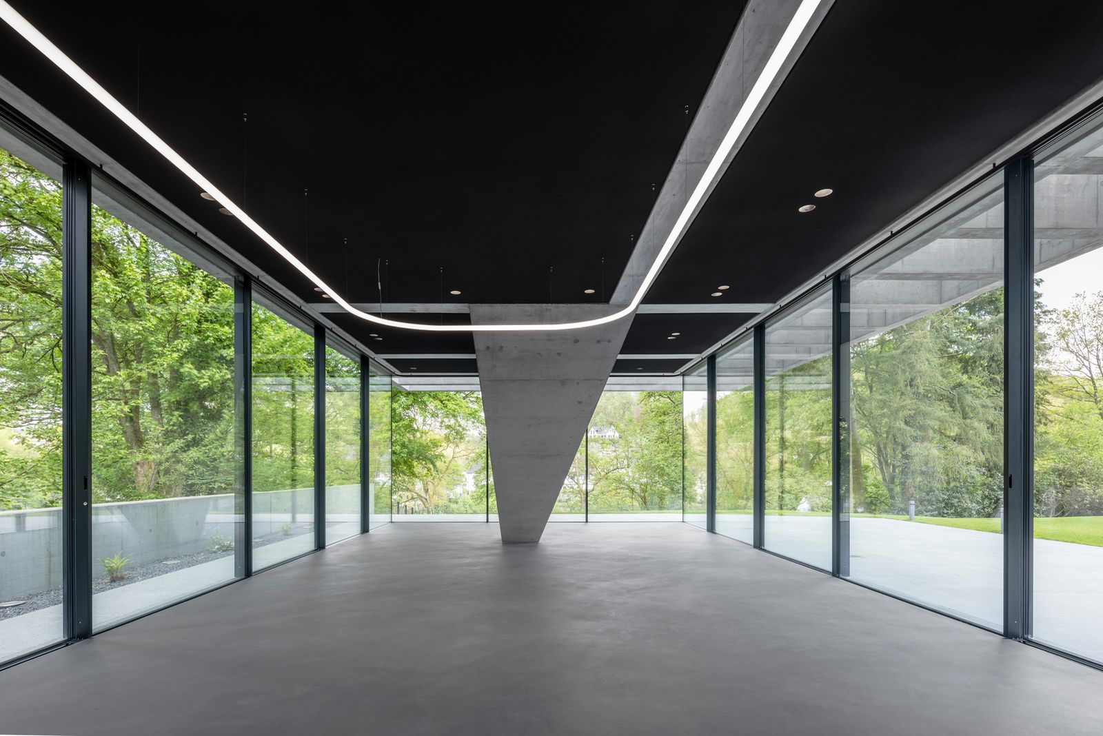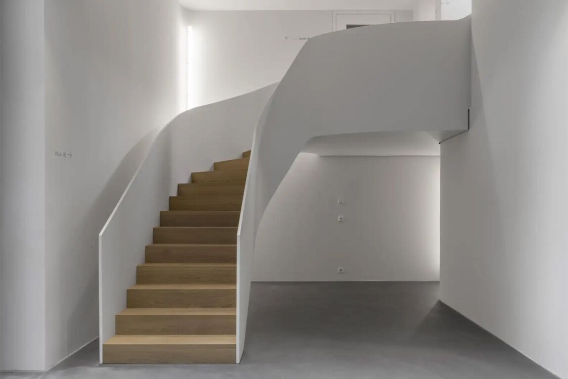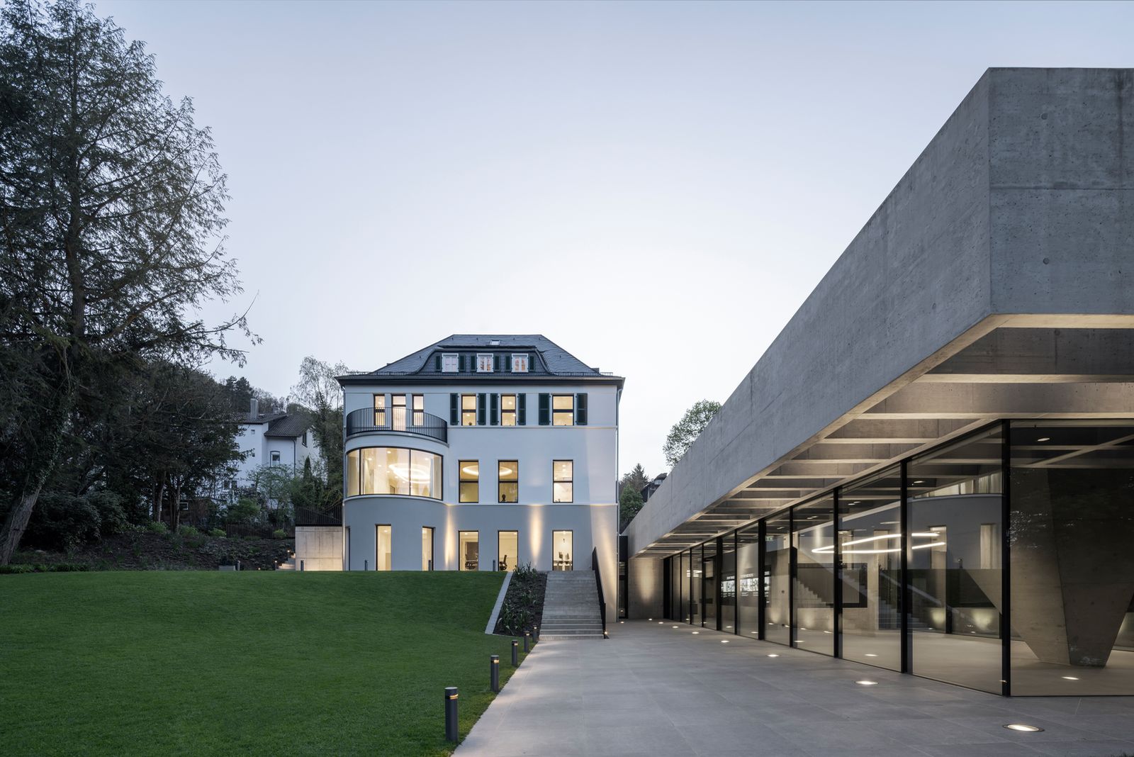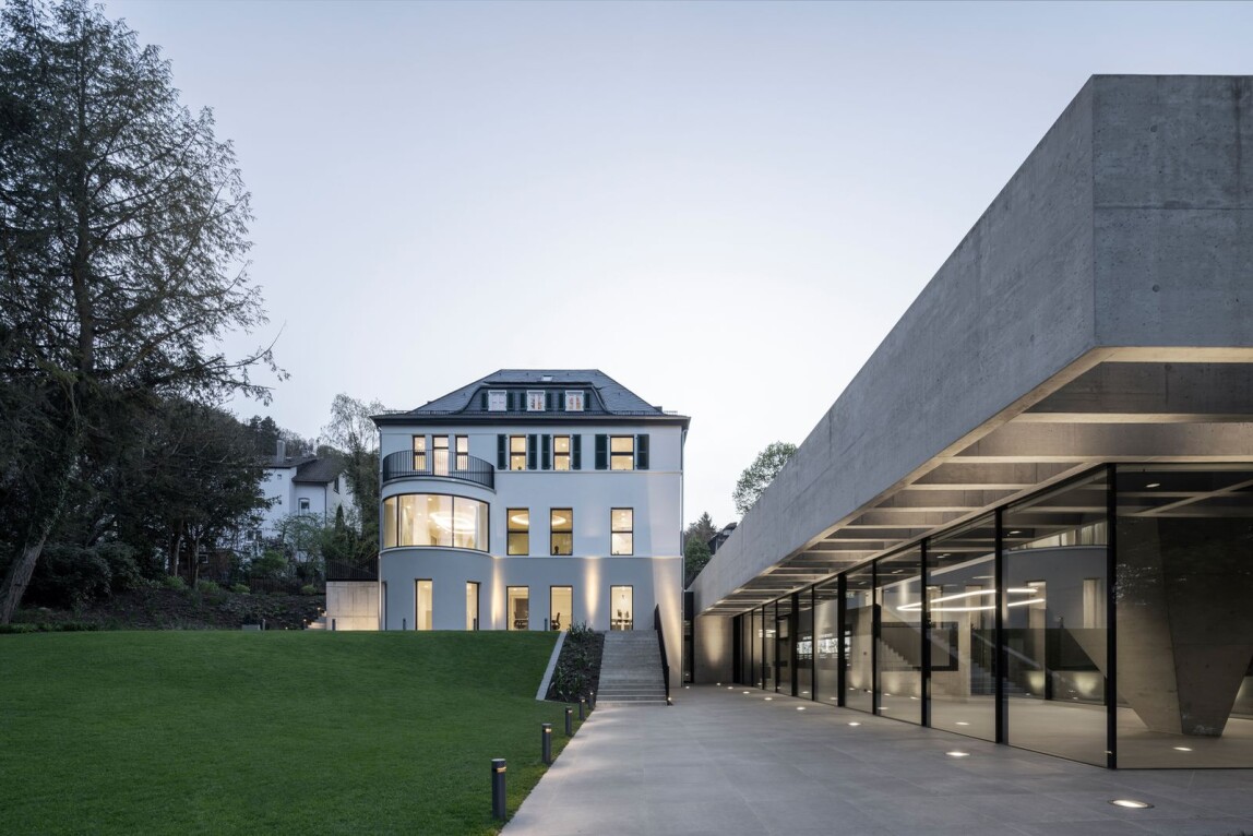 Während die Villa durch zurückhaltende Innenarchitektur, helle Holzoberflächen und dezente Farbgebung geprägt ist, setzt der Neubau auf Sichtbeton, Glas und ein Kassettendach. Beide Gebäudeteile sind über eine skulptural geformte Stahltreppe miteinander verbunden. Die Gestaltung verfolgt das Ziel, Vergangenheit und Zukunft architektonisch miteinander zu verbinden.
