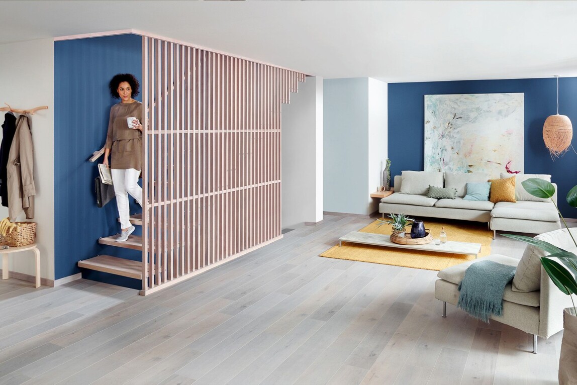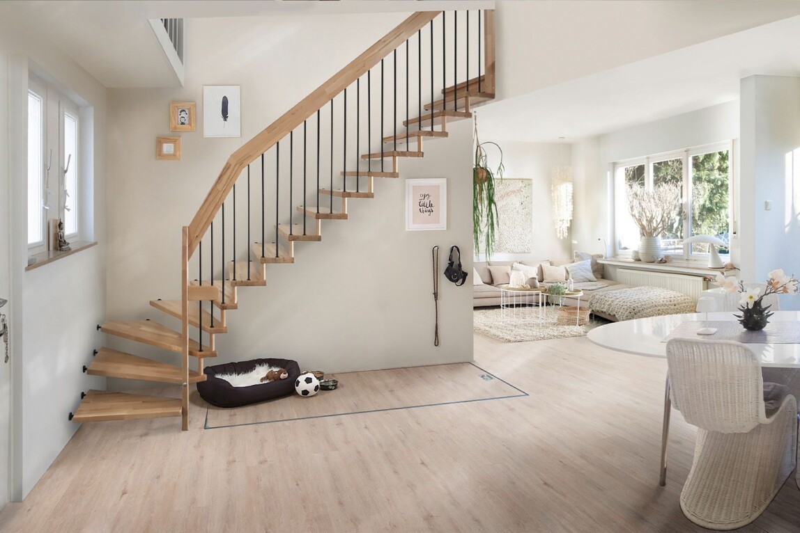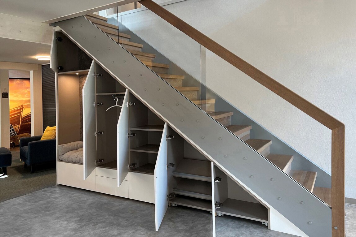 Ein weiterer Vorteil ist, dass der Raum unterhalb der Stufen Platz für Einbauschränke, Schubladen, Regale und sogar Sitznischen lässt. Wer keinen zusätzlichen Stauraum benötigt, kann eine freitragende Treppe ohne Setzstufen wählen, die den Raum offener und heller gestaltet. Bei der Systemtreppe „Claustra” sind die Stufen direkt in der Wand eingelagert, die raumseitig über Leisten abgehängt werden. Reichen sie im Erdgeschoss bis zum Boden, kaschieren sie den Kellerabgang. Bei der Treppe in den Keller entsteht durch die Leisten eine abgetrennte Nische mit Stauraum unterhalb der Stufen.