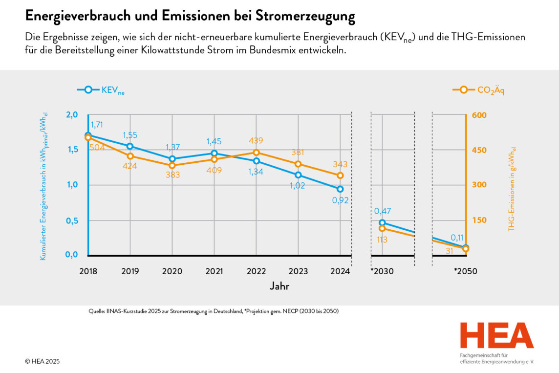 Der Ergebnisbericht der Kurzstudie „Der nichterneuerbare kumulierte Energieverbrauch und THG-Emissionen des deutschen Strommix im Jahr 2024 sowie Ausblicke auf 2030 und 2050” stehen zum kostenlosen Download unter hea.de/iinas-studie oder hier zum PDF-Direktdownload zur Verfügung.