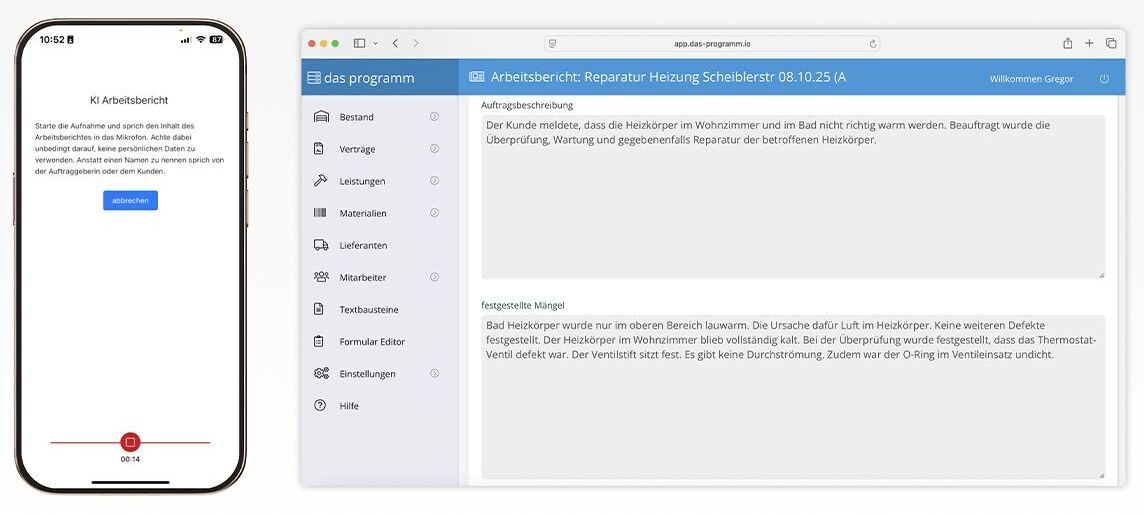 Aus Arbeitsberichten oder Auftragsnotizen, die Handwerker vor Ort per Sprache erfassen, erstellt die KI automatisch vollständige, fachgerechte Dokumentationen. Im Büro werden Aufträge, Lieferanten und Kosten in Eingangsrechnungen automatisch erkannt und zugeordnet.
