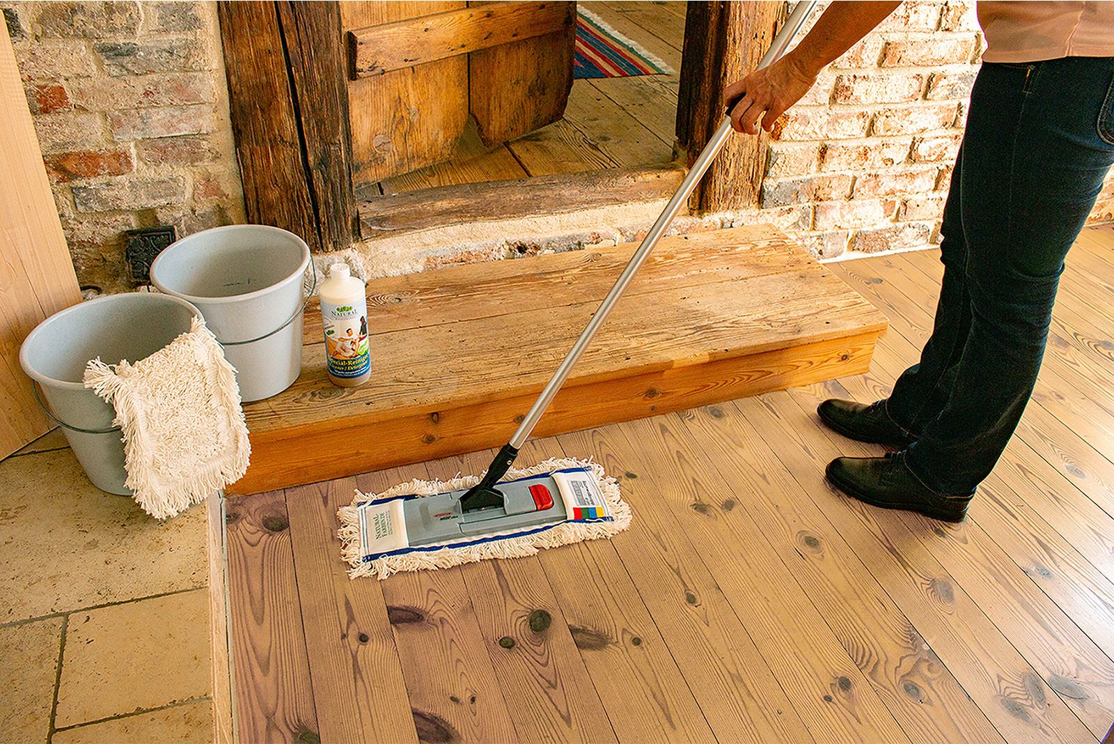 Es empfiehlt sich ein Spezialreiniger mit Weißpigment für die schonende Unterhaltsreinigung. Dieser enthält wenig Seife, aber viele nachpflegende Öle. Die Zusammensetzung der Pigmentöle auf Leinölbasis kommt auch dem Raumklima und damit dem Wohlbefinden der Bewohner zugute. Sie bestehen aus rein natürlichen Inhaltsstoffen – ohne Kunstharze und bedenkliche Lösungsmittel. Dank der freiwilligen Volldeklaration sind alle Inhaltsstoffe transparent.