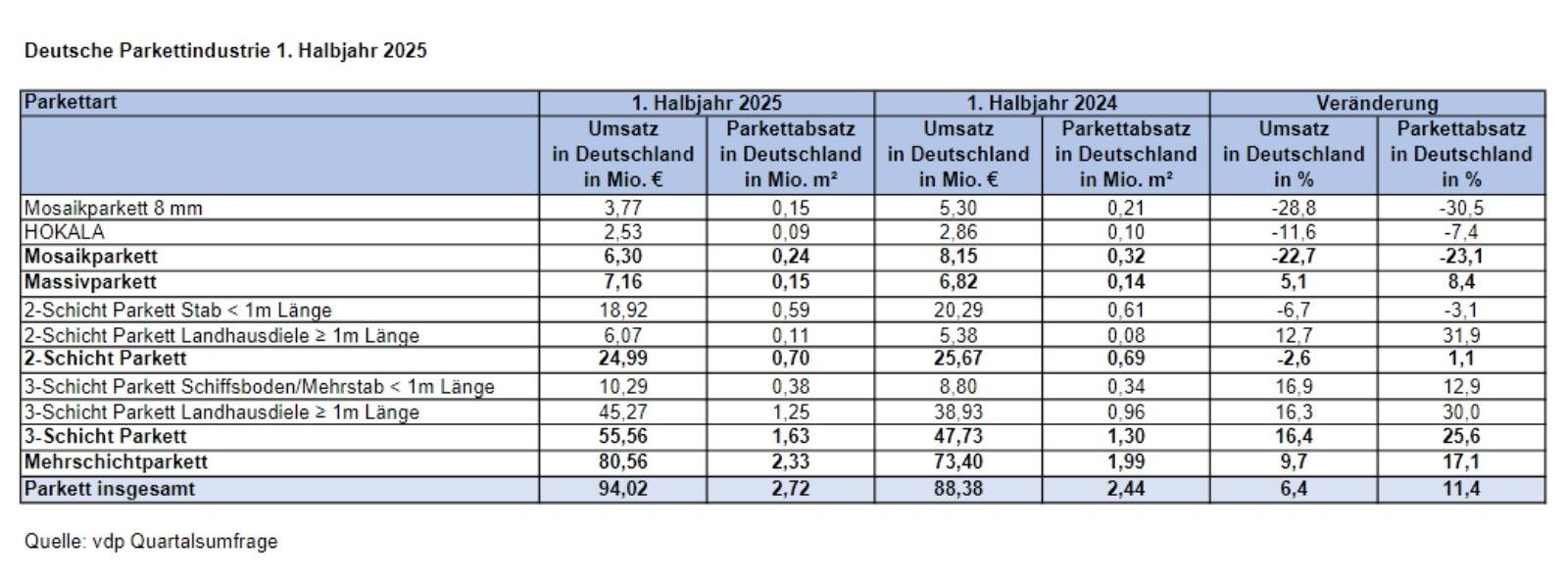 (3.11.2025) Die Mitgliedsunternehmen des Verbands der Deutschen Parkettindustrie (vdp) setzten im ersten Halbjahr 2025 rund 2,7 Mio. m² Parkett ab. Das entspricht einem Zuwachs von 11 % gegenüber dem Vorjahreszeitraum. Der Umsatz stieg um 6 % auf etwa 94 Mio. Euro.