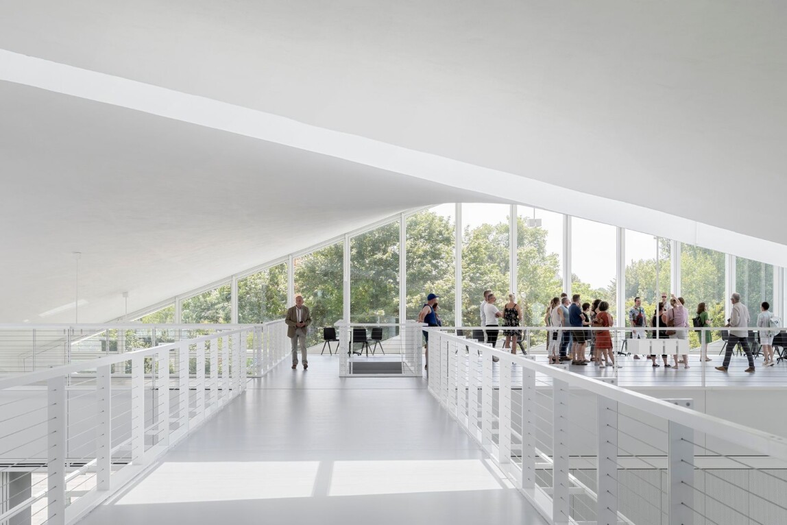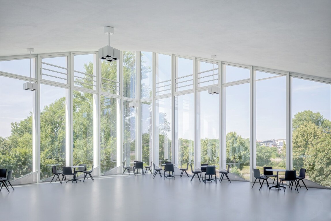 Im Zuge der Sanierung wurde neben der ikonischen Dachschale auch der Innenraum neugestaltet. Vier Kuben mit Galerieebenen und Brücken nehmen das quadratische Grundprinzip Ulrich Müthers auf. Für die Böden entschieden sich die Planer für unterschiedliche Lösungen: Sichtestrich im Erdgeschoss, im Obergeschoss auf 1.200 m² der Kautschukboden Noraplan uni in einem Grauton.