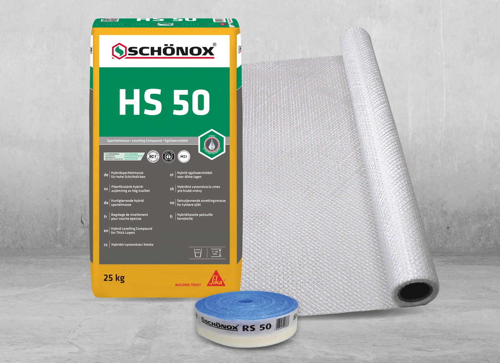 Zu den Systemkomponenten gehören das multiaxiale AR-Glasfasergelege Schönox Renotex, die Hybridspachtelmasse Schönox HS 50 mit Active-Dry-Technologie sowie der Randstreifen Schönox RS 50. Durch die Kombination dieser Produkte soll eine hohe Belastbarkeit und Formstabilität erzielt werden.