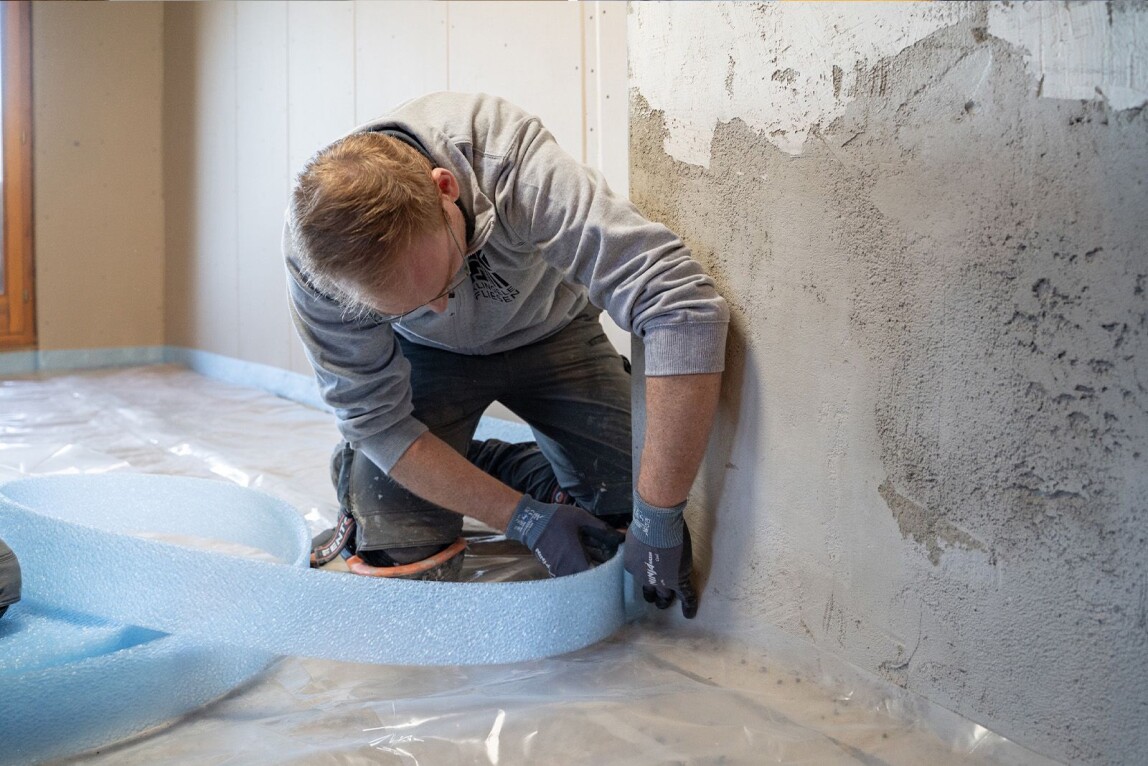 Auf einer Fläche von 85 m² sollte eine neue Wohneinheit mit Wohnküche, Schlafzimmer, Kinderzimmer, Flur und Bad entstehen. Da die Höhe der vorhandenen Holztreppe beibehalten werden musste, war ein geringer Bodenaufbau ohne Niveauunterschiede gefordert. Die Holzbalkendecke des Holzständerhauses erlaubte nur eine begrenzte Zusatzlast – ein klassischer Estrich kam daher nicht infrage. Der beauftragte Fachbetrieb Klingele Fliesen GbR aus Stegen entschied sich nach Beratung mit dem Bauherrn für das neu entwickelte System Stronglite von Ardex.