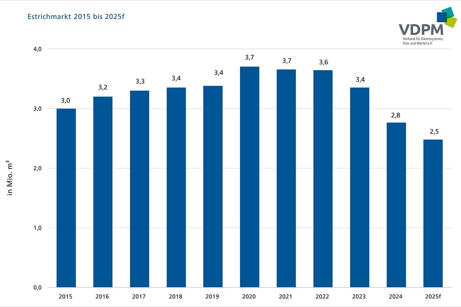 (6.11.2025) Die Baukonjunktur zeigt auch 2025 deutliche Bremsspuren: Laut aktueller Estrichmörtel-Marktstatistik des Verbands für Dämmsysteme, Putz und Mörtel e.V. (VDPM) in Zusammenarbeit mit der B+L Marktdaten GmbH, ging der Absatz im laufenden Jahr um 10,3 % gegenüber 2024 zurück. Damit verringerte sich das Marktvolumen von 2,8 Mio. m³ auf 2,5 Mio. m³. Zwar fällt der Rückgang geringer aus als im Vorjahr (-19 % gegenüber 2023), dennoch bleibt das Minus zweistellig. Auch die Hochrechnung für das vierte Quartal zeigt keine Anzeichen einer kurzfristigen Erholung, trotz leicht steigender Baugenehmigungszahlen.