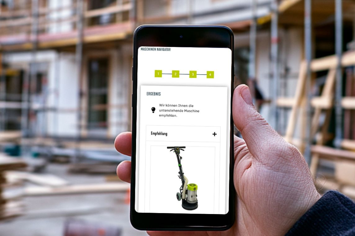 Der Maschinennavigator ist über die Landingpage wolff-tools.com/maschinen-navigator sowie über die Uzin Utz Go App verfügbar. Die Bedienung erfolgt in vier Schritten: