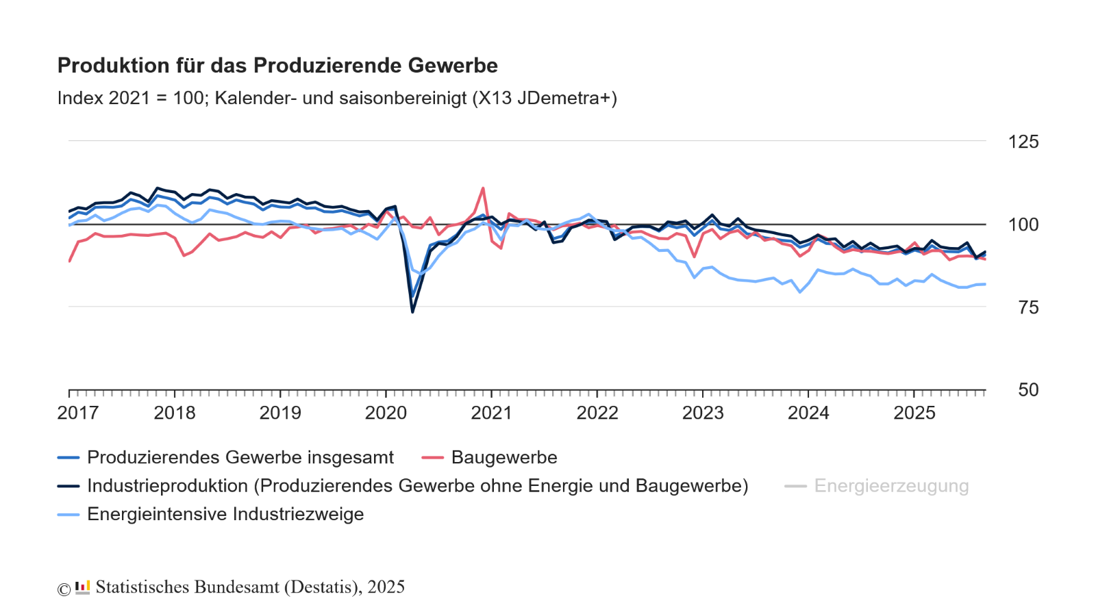 In den energieintensiven Industriezweigen ist die Produktion im September 2025 gegenüber August 2025 um 0,1 %1) gestiegen. Im Dreimonatsvergleich war die Produktion in den energieintensiven Industriezweigen im 3. Quartal 2025 um 0,5 % niedriger als im 2. Quartal. Verglichen mit dem Vorjahresmonat September 2024 war die energieintensive Produktion im September 2025 um 0,2 %2) niedriger.