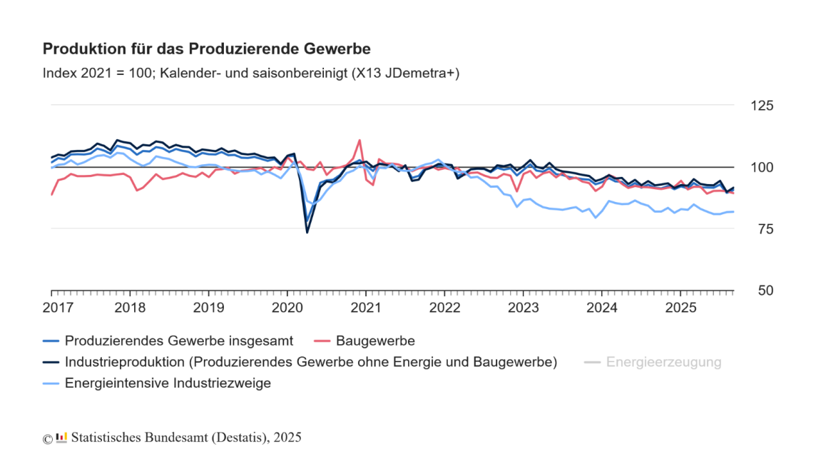 Die Industrieproduktion (Produzierendes Gewerbe ohne Energie und Baugewerbe) stieg im September 2025 gegenüber August 2025 um 1,9 %1). Innerhalb der Industrie war ein Anstieg über alle drei Hauptgruppen zu verzeichnen: Die Produktion von Investitionsgütern stieg um 3,8 % und die Produktion von Konsum- und Vorleistungsgütern um jeweils 0,2 %. Außerhalb der Industrie stieg die Energieerzeugung um 1,3 %. Die Bauproduktion hingegen sank um 0,9 %.
