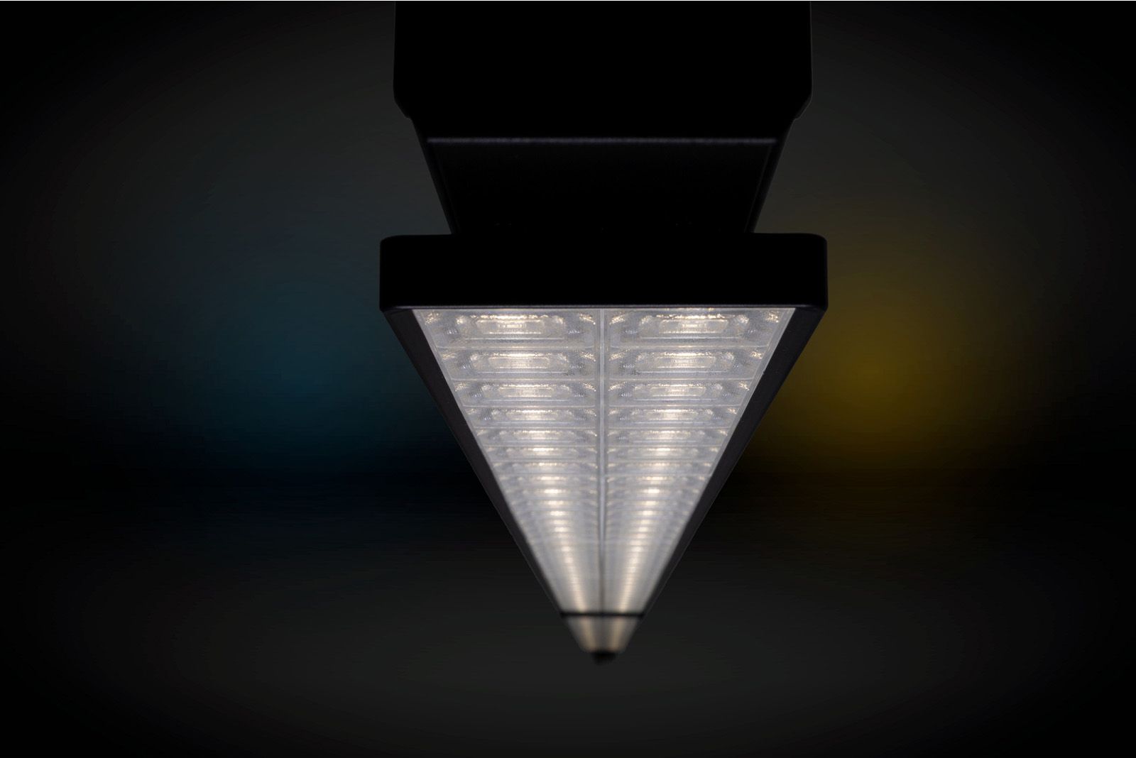 Die Linsenoptik erzeugt ein gleichmäßiges, augenschonendes Lichtbild mit einem Farbwiedergabeindex über 90 und einer Farbstabilität von SDCM 3. Reflexionen einzelner LED-Punkte werden durch abgestimmte Streuelemente minimiert. Lichtfarben von 3000 und 4000 Kelvin sowie Tunable White stehen als Optionen zur Verfügung.