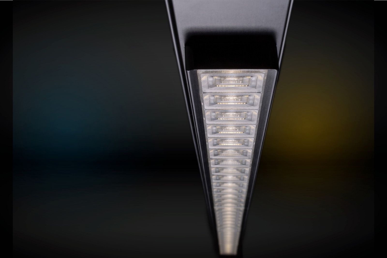 Die OptiLens-Technologie kombiniert Eigenschaften von Microprismen- und Einzellinsentechnik. Dadurch wird eine homogene Lichtverteilung mit reduziertem Mehrfachschatten erreicht. Die Lichtbandsysteme erzielen einen UGR-Wert ≤ 16 und erfüllen damit die Anforderungen an visuelle Ergonomie in Arbeitsumgebungen wie Prüfarbeitsplätzen, Rechenzentren oder Bildungseinrichtungen. Mit einer Lichtausbeute von bis zu 171 lm/W tragen sie zu energieoptimierten Beleuchtungskonzepten bei. Je nach Raumhöhe stehen breitstrahlende und tief-breitstrahlende Varianten zur Verfügung, wodurch ein durchgängiges Beleuchtungskonzept über verschiedene Zonen hinweg realisiert werden kann.