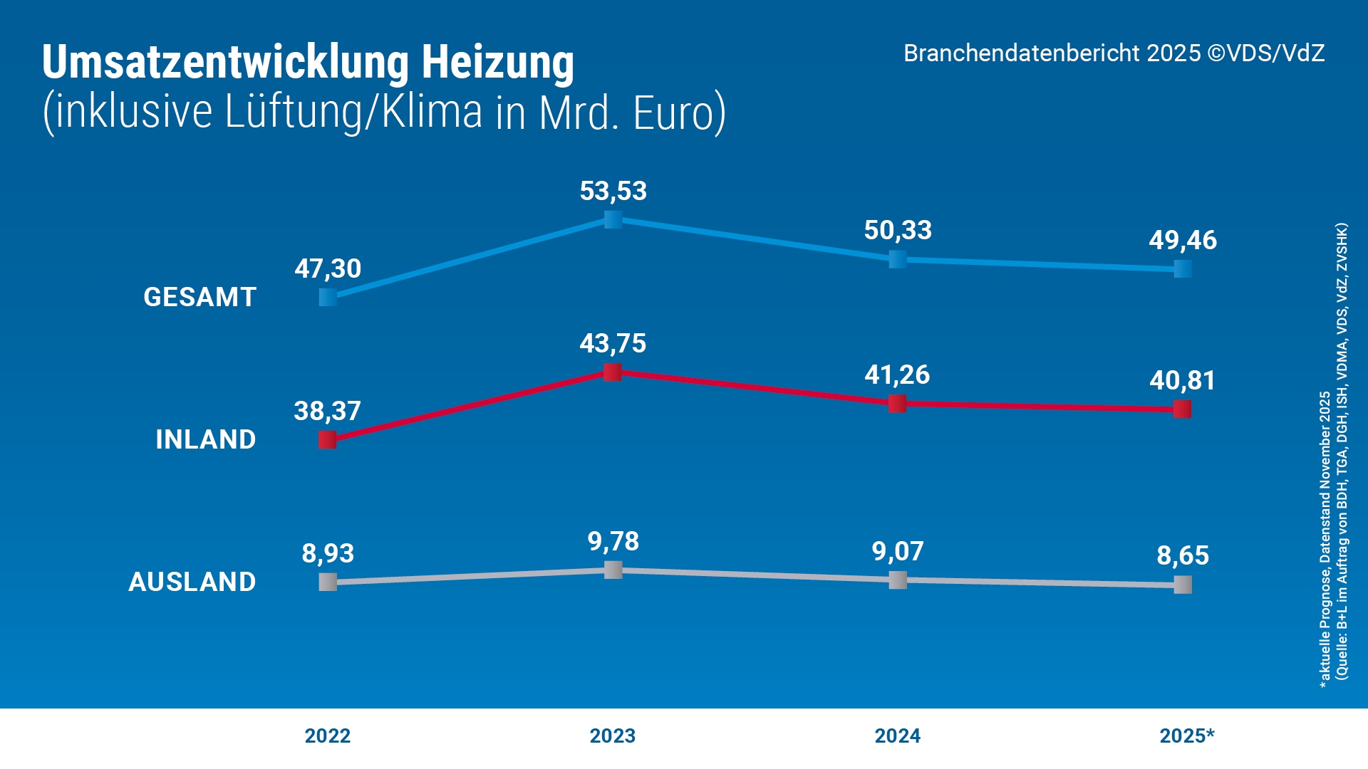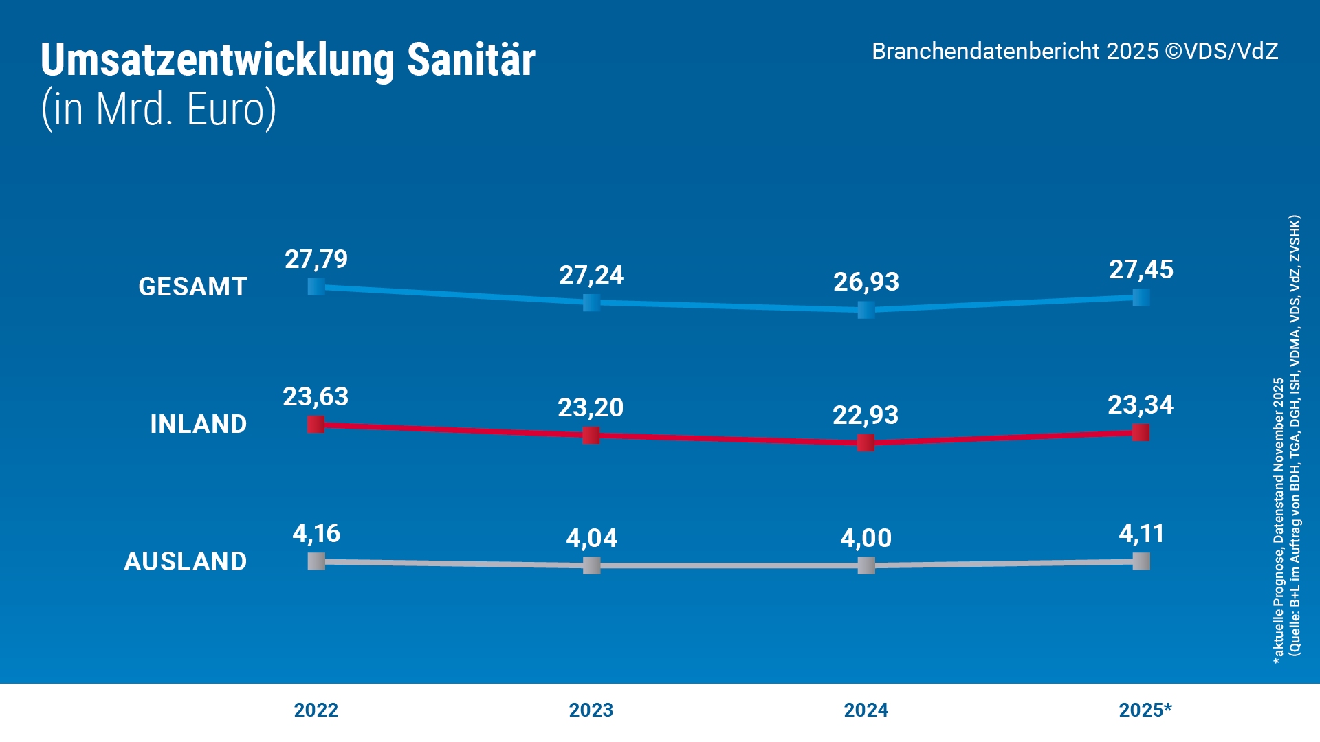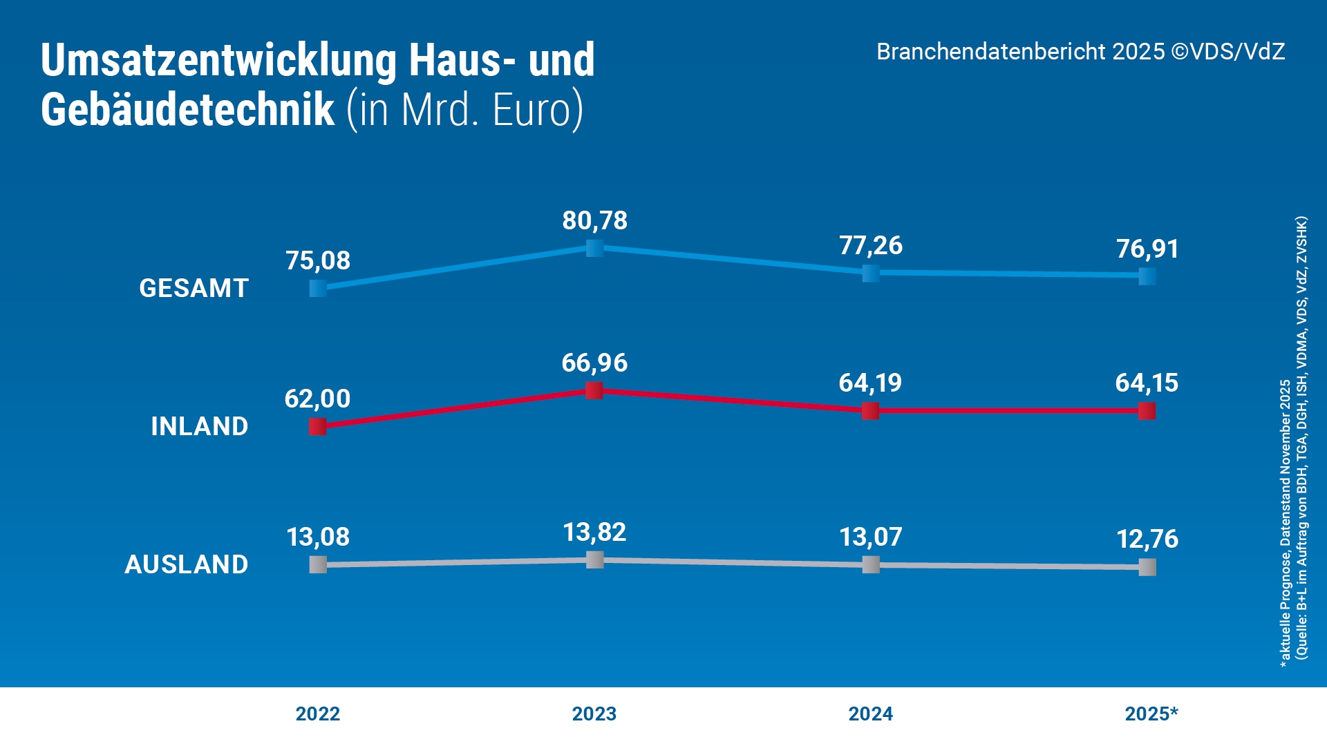 Die Branche stand insbesondere in den Jahren 2024 und 2025 vor erheblichen Herausforderungen. Nach einem nominalen Umsatzrückgang von 4,4 % in 2024 auf insgesamt 77,26 Mrd. Euro, wird für 2025 ein weiterer leichter Umsatzrückgang von 0,4 % prognostiziert. Betroffen ist die Industrie mit einem Umsatzminus von 9,5 % im Jahr 2024, während der Sanitärbereich erste positive Signale verzeichnet. Der Großhandel meldet einen Rückgang um 13,2% und die installierenden Betriebe einen Umsatzrückgang von 4,5 %.