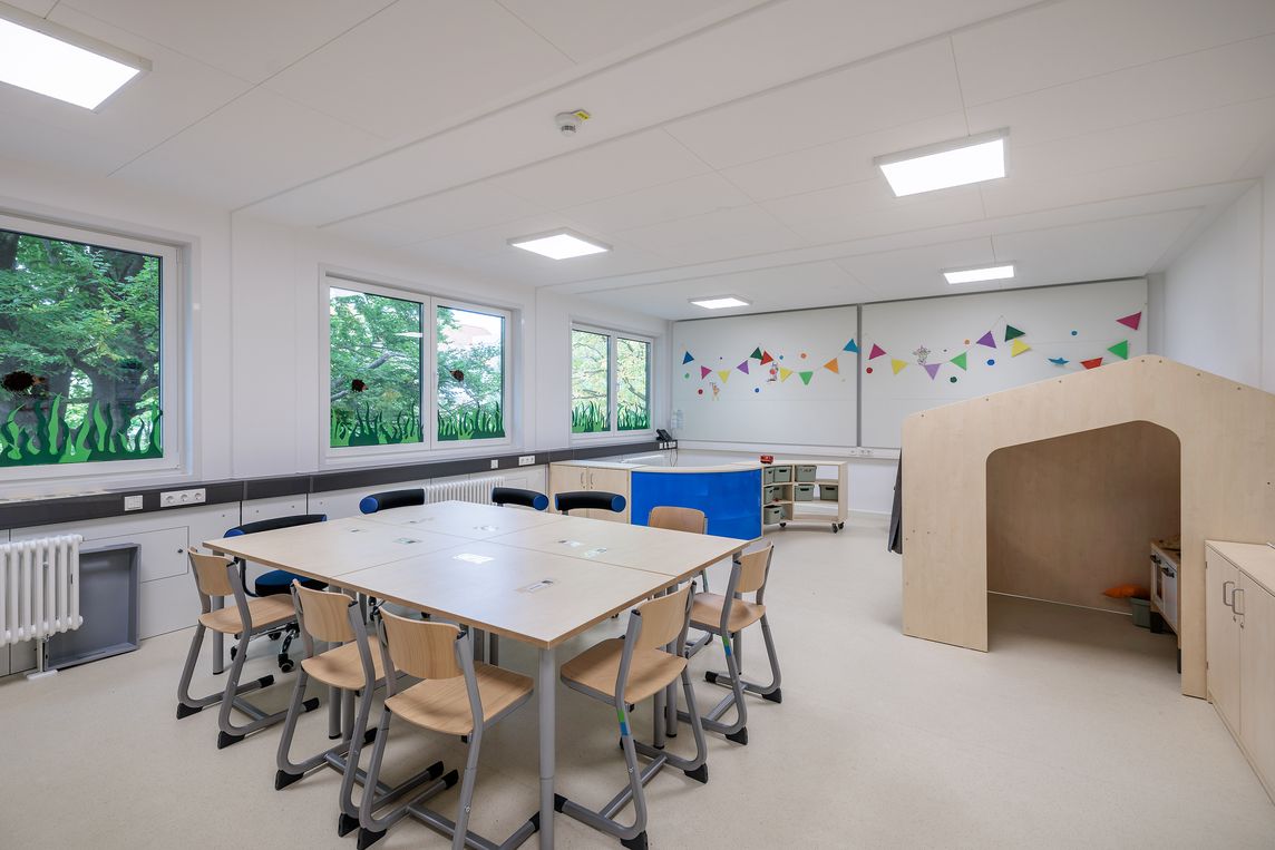 Die dreigeschossige Bauweise bot die passende Lösung für die geringe Bauplatzgröße. Das verwendete Hybrid Modulsystem von Adapteo verbindet die Vorteile von Stahl mit den nachhaltigen Qualitäten von Holz. Die Modularität des Gebäudes und die nicht tragenden Wände sollen Erweiterungen und Aufstockungen einfach gestalten. Die Interimsschule wurde mit 1.584 m² Fläche auf Schraubfundamenten errichtet. Zur Ausstattung zählen Warmwasser-Heizung, Teeküche und Pflegeräume.