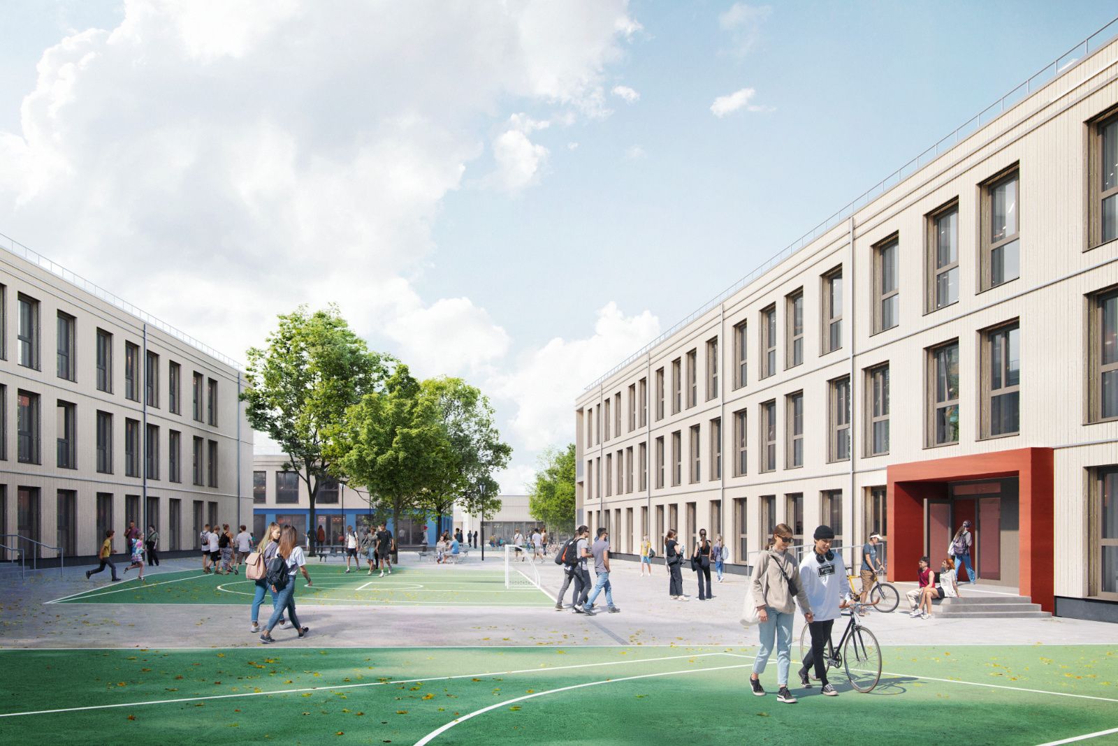 Die modularen Gebäude mit insgesamt rund 30.000 m² Bruttogeschossfläche – inklusive Sporthallen und Großküchen – sollen die Anforderungen moderner pädagogischer Raumkonzepte erfüllen. Die über 1.000 Holzmodule sind rückbaubar, kombinierbar und für eine Wiederverwendung an Drittstandorten vorgesehen.