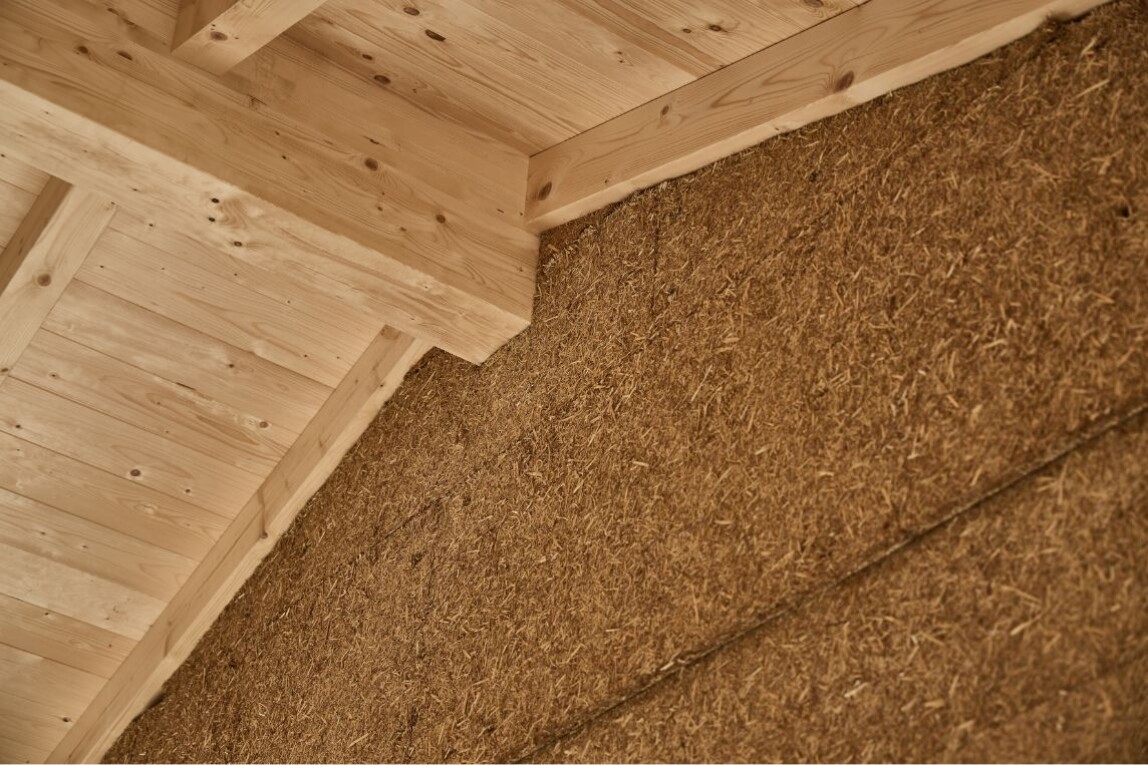 Der Dämmstoff „NaturaSpan” aus Holzspänen und Lehmpulver trägt durch seine hohe Masse zu einem verbesserten sommerlichen Wärmeschutz bei. Ergänzend übernehmen Strohplatten von Maxit die Funktion des Putzträgers und unterstützen die Dämmung. Damit erreichen die Außenwände einen U-Wert von 0,150 W/(m²K).