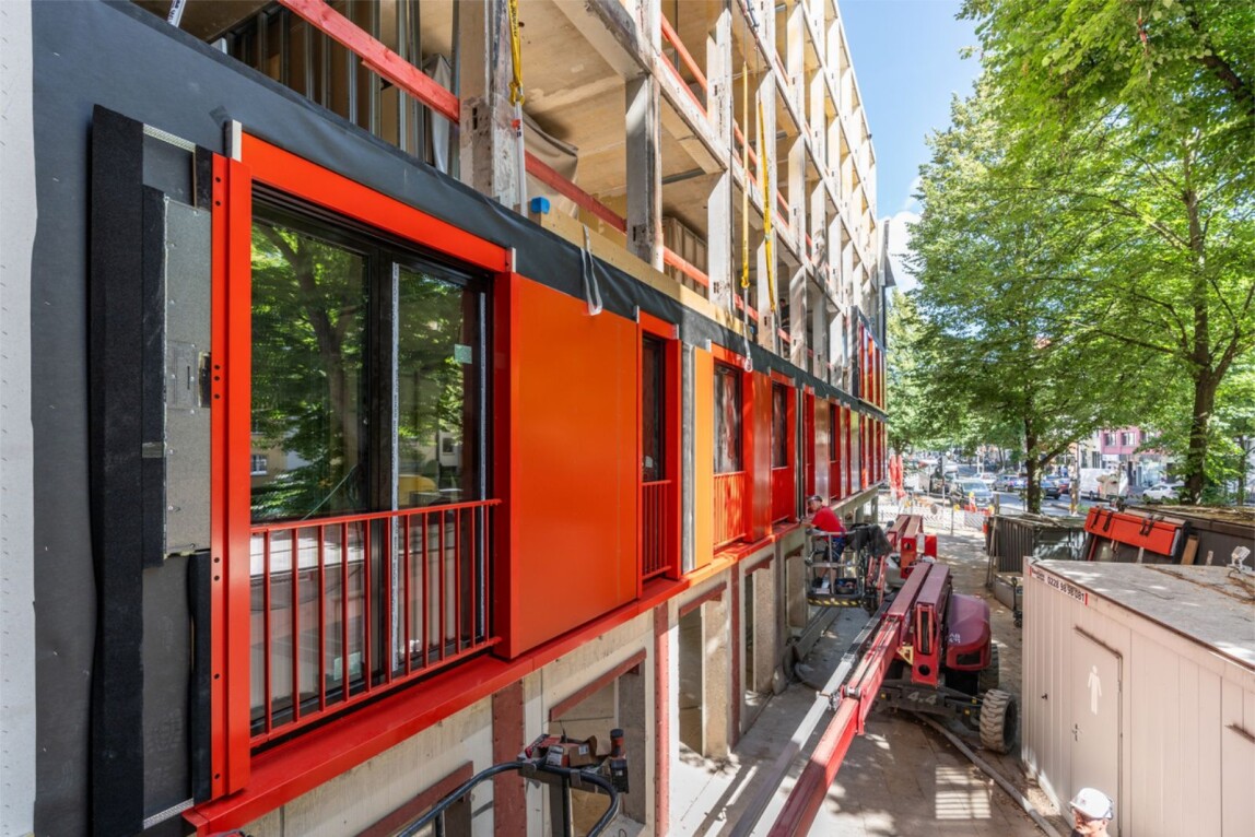 Die Holzrahmenbauelemente wurden komplett vorgefertigt – inklusive Dämmung, Fenstern und Fassadenverkleidung. Diese Vorgehensweise reduzierte die Bauzeit und den Baustellenverkehr in der Innenstadt. Eine just-in-time-Logistik und die Montage per Kran ermöglichten einen präzisen Ablauf auf begrenztem Raum.
