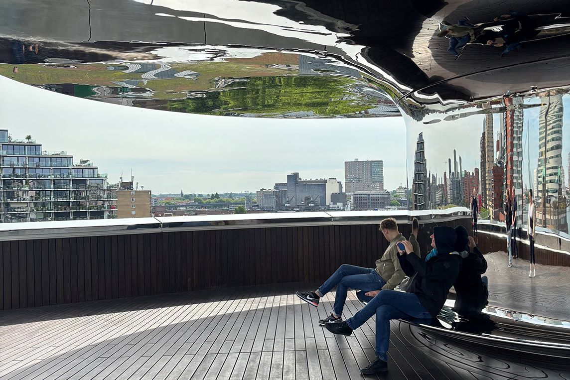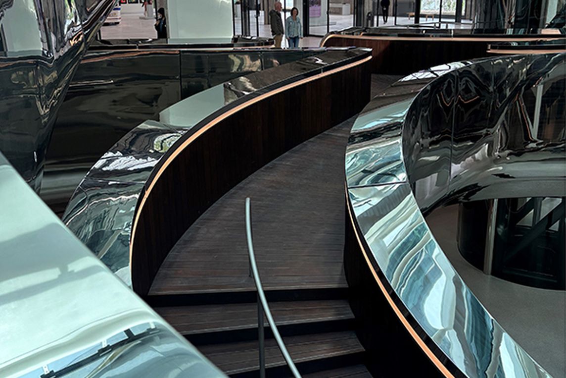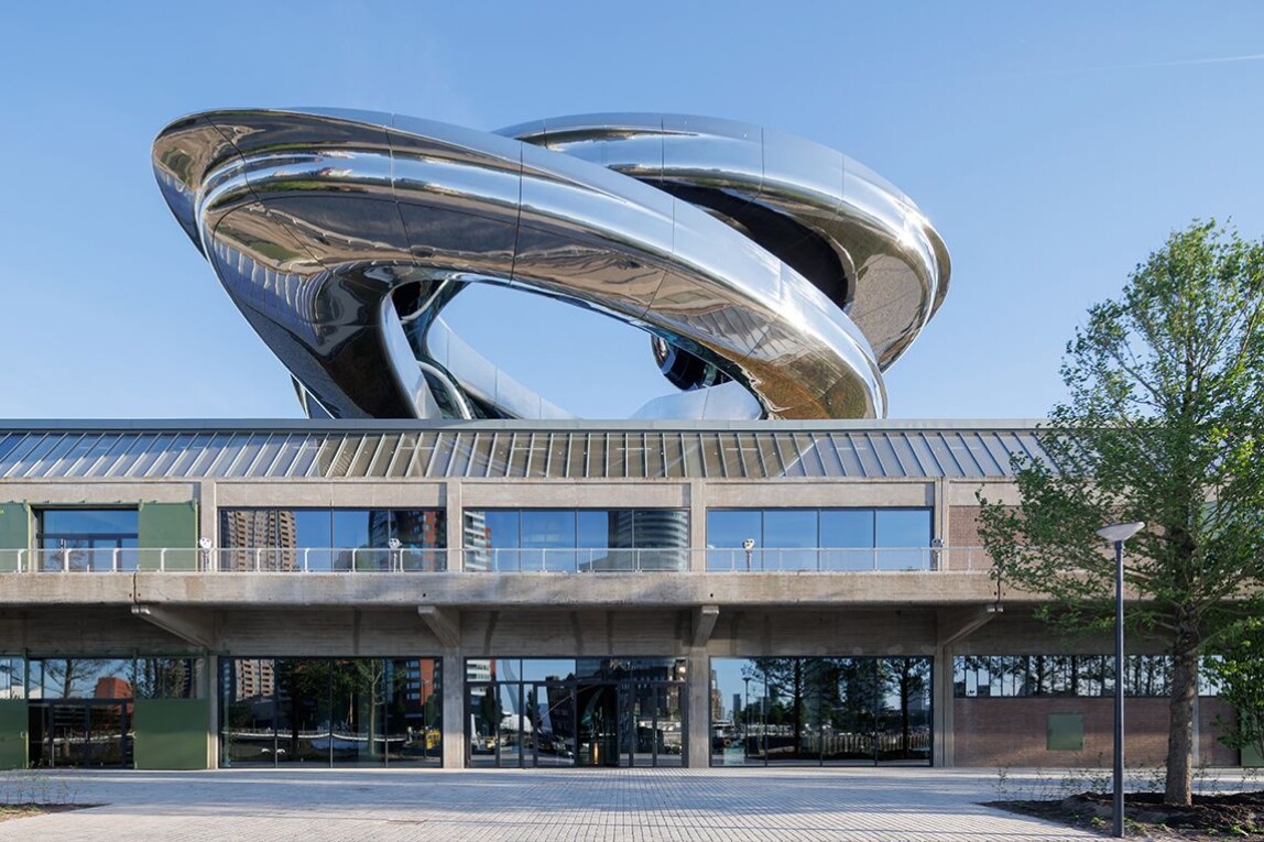 (27.11.2025) Im Zentrum des 16.000 m² großen, aus einem Hafenspeicher von 1923 transformierten Museums in Rotterdam, steht die „Tornado”-Treppe. Zwei spiralförmig verbundene Strukturen tragen sich ohne zusätzliche Stützen; 336 Stufen führen Besucher auf eine Aussichtsplattform über der Maas. Die äußere Hülle besteht aus 297 individuell polierten Edelstahlpaneelen, die Himmel und Stadt reflektieren.