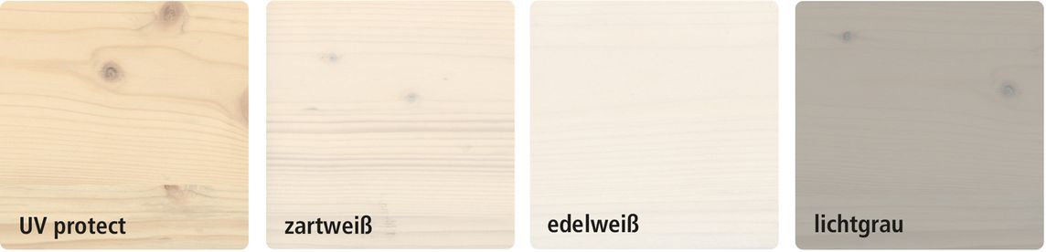 Alle Varianten erhalten die Diffusionsoffenheit des Holzes. Auf Wunsch sind weitere Farbtöne möglich.