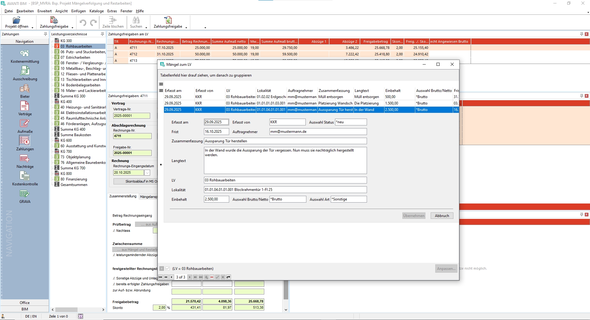 Für mehr Komfort bei der täglichen Arbeit sorgt ein neues Mängelmanagement, das Mängel zentral erfasst, mit Leistungsverzeichnis (LV) bzw. Raum oder Bauteil verknüpft und gewerkeübergreifend für das Projektmanagement in Leistungsphase 8 zur Verfügung stellt. Damit lässt sich ein direkter Bezug zum Projekt und zur Zahlungsfreigabe herstellen. Mängel können künftig zusätzlich im offenen BCF-Datenformat (BIM Collaboration Format) ausgegeben und an CDE-Plattformen verschiedener Hersteller übergeben werden.