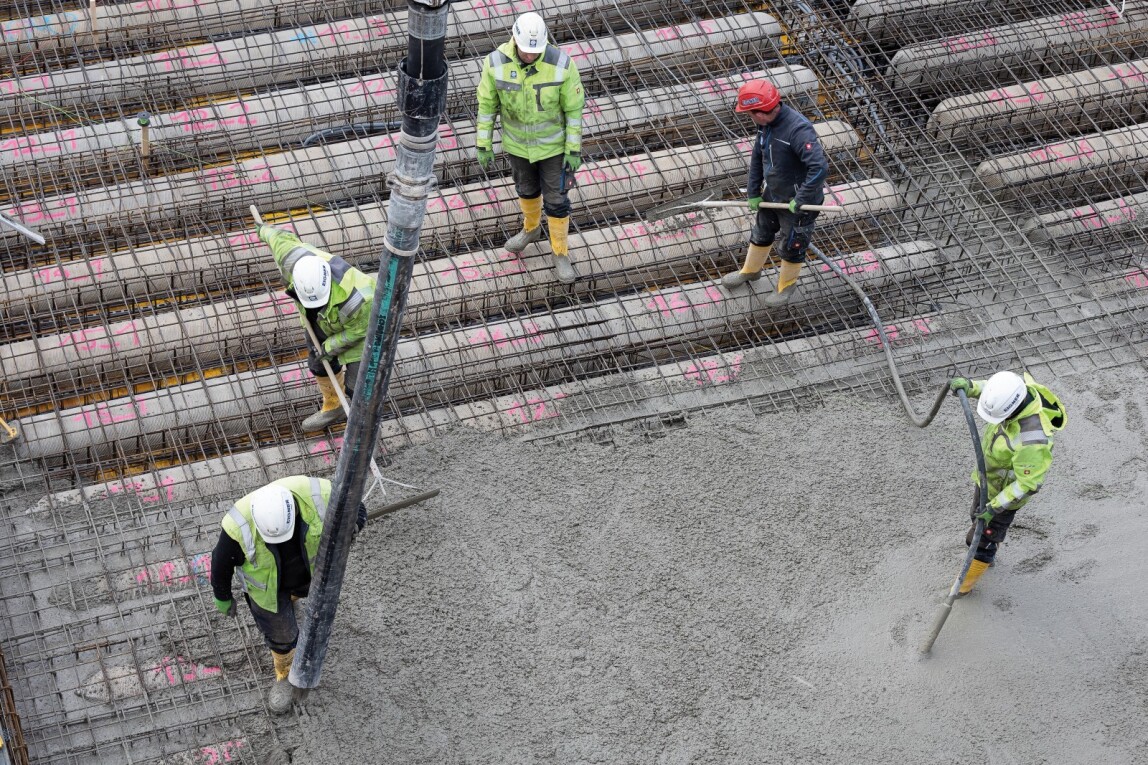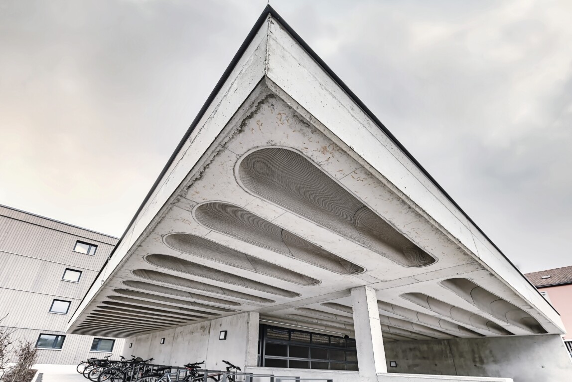 Einsatz von 3D-gedruckten Betonsegmenten als integrierte Schalung für Stahlbetonrippendecken. Die Hohlkörper führen zu einer Materialeinsparung von 40% Beton und 30% weniger Betonstahl. In Verbindung mit einer CO₂-optimierten R-Betonrezeptur gelingt eine Einsparung von 35% CO₂ gegenüber der zuerst geplanten Stahlbetonflachdecke. Beton werde nur dort eingesetzt, wo dieser benötigt wird.