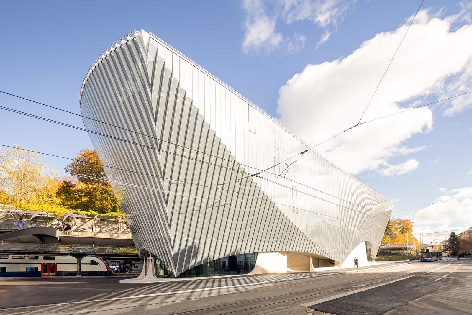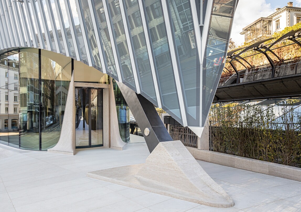 Die Gebäudekubatur greift die städtebaulichen Kanten auf. Das zurückversetzte Erdgeschossniveau schafft eine neue, großzügige Fußgängerebene. Die von Calatrava entworfene Fassade lehnt sich in ihrer rhythmisch-organischen Gliederung an seine aktuellen Kunstobjekte an – ein skulpturales Spiel aus Linien, Licht und Transparenz.