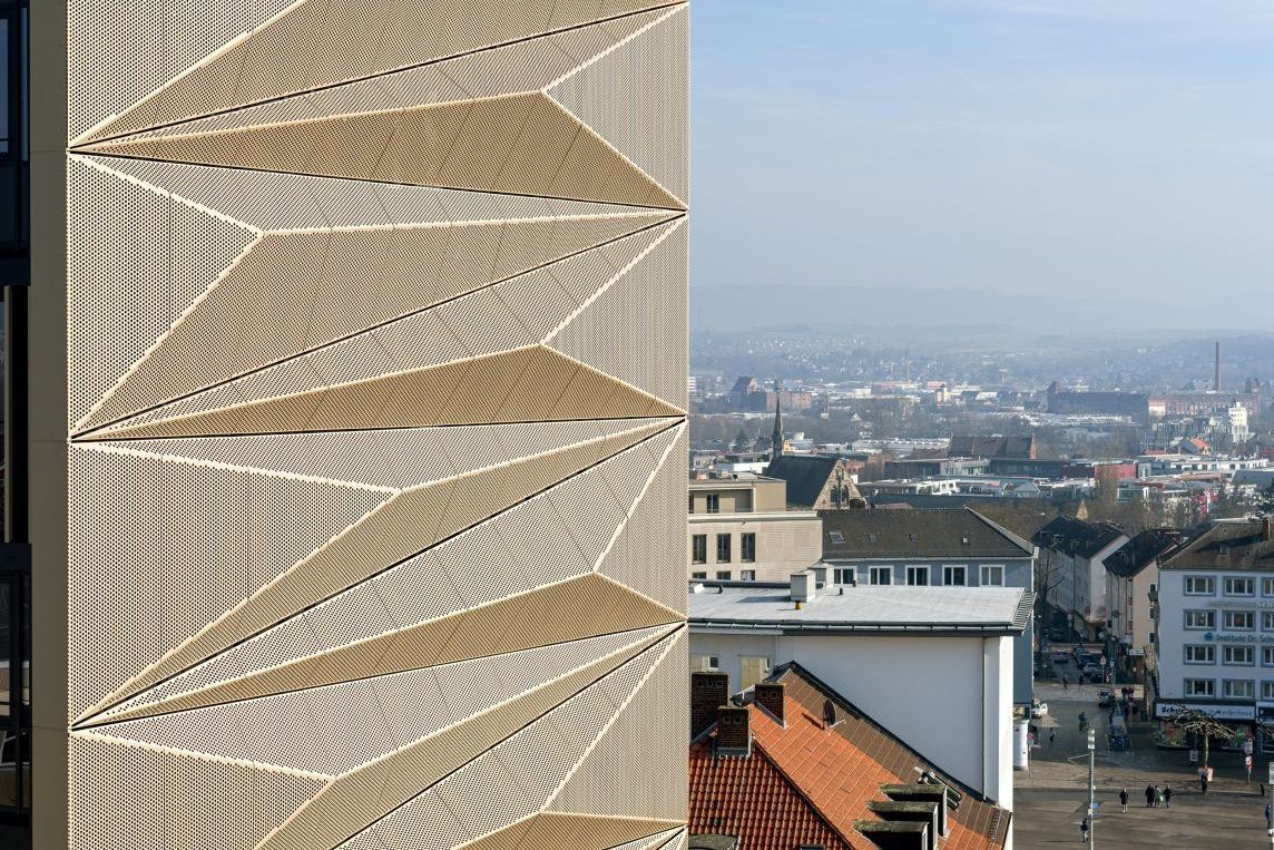 (5.12.2025) Die Neugestaltung der Fassade an der Stirnseite des GWH-Bürogebäudes in der Kölnischen Straße 4 in Kassel, geplant vom Architekturbüro Dietz Joppien Hammerschmidt aus Frankfurt am Main, zeigt sich in einem dreidimensionalen, sandfarbenen Design aus Metallpaneelen. Laut Geschäftsführer Christopher Hammerschmidt wurde hier das Ziel einer Neuinszenierung der alten Fassade mit städtebaulicher Wirkung verfolgt.
