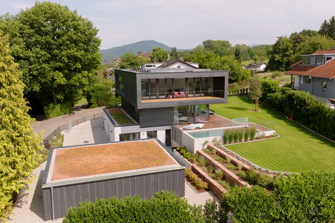 Der aufgrund der Hanglage zwei- bis dreigeschossig ausgebildete Baukörper mit auskragendem Obergeschoss – der „Flying Cube” – zeigt eine klare Formensprache und setzt auf die Kombination aus Schiefer, großflächigen Verglasungen und Holz. Nach Süden und Westen öffnen bodentiefe Fenster und eine rückversetzte Loggia den Blick über Garten und Rheinebene, während auf der Nordseite Fernsichten bis in die Pfalz und die Vogesen möglich sind.