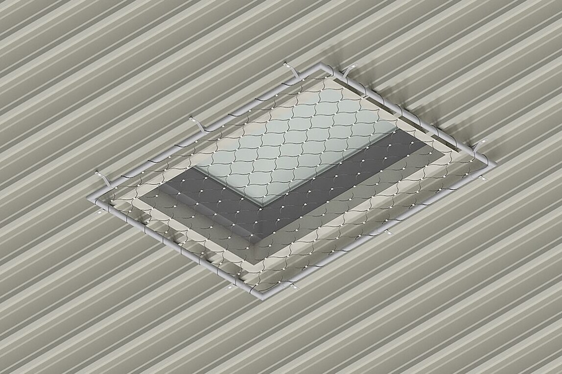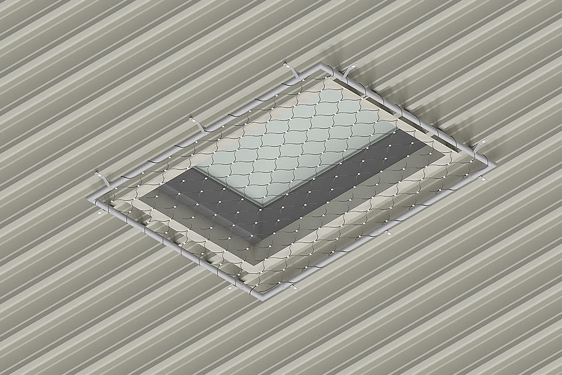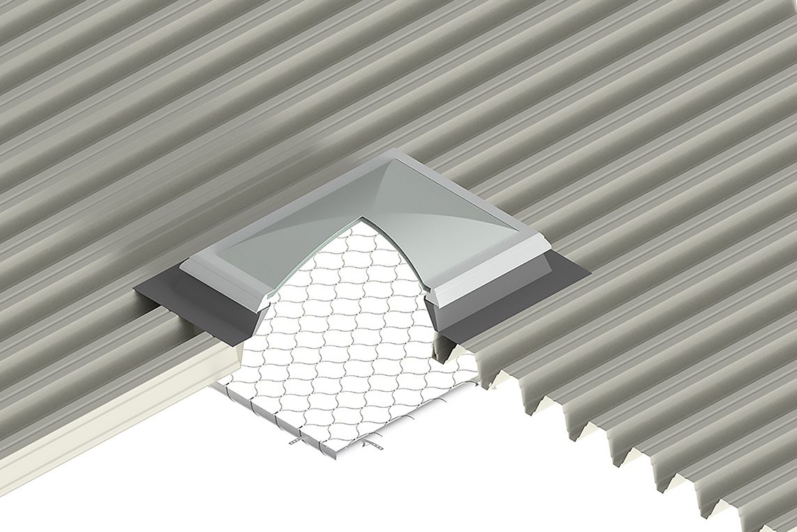 Die Dome Light Protection besteht aus einem Aluminiumrahmen und einem Edelstahlnetz, das unterhalb der Dachkonstruktion angebracht wird. Eine Öffnung der Lichtkuppel ist dabei nicht erforderlich. Dadurch bleibt die Dachabdichtung unberührt, und der Öffnungsmechanismus der Lichtkuppel muss nicht ausgespart werden.