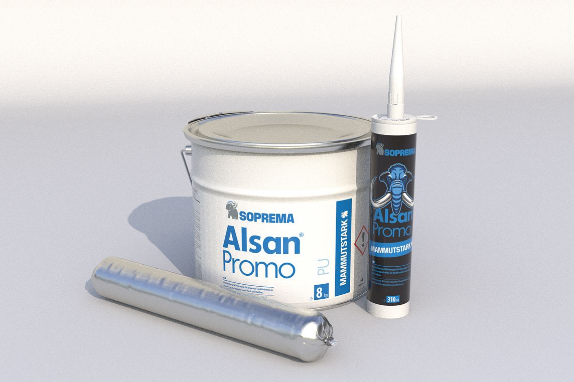 Die Formulierung basiert auf der Quadro-Technologie und ist auf den Einsatz im System mit Alsan Flashing Quadro abgestimmt. Alsan Promo ist in drei Gebindegrößen erhältlich: Kartusche (310 ml), Eimer mit Beutel (8 kg) und Schlauchbeutel (600 ml).