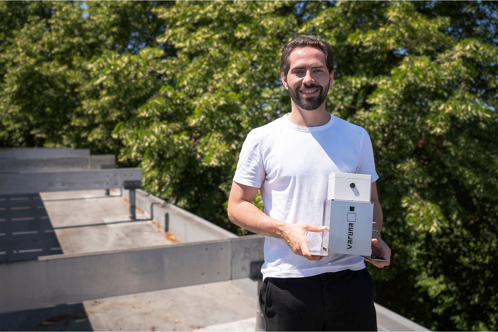 „In einem wetterfesten Edelstahl-Kubus befindet sich eine Art ‚digitaler Zollstock’, der den Wasserstand auf dem Dach misst. Dieses nur 26,5 cm hohe Gehäuse wird windsogfest mit Gewichten auf dem Dach fixiert, ohne die Dachhaut zu verletzen. Wenn der Wasserstand einen individuell festgelegten Grenzwert übersteigt, z.B. weil Laubansammlungen den Kiesfang des Gullys verstopfen, oder ein Starkregenereignis einen Wasseranstau auf dem Dach verursacht, sendet der digitale Regenwächter einen Alarm”, so Christian Behr, Produktmanager bei Sita.