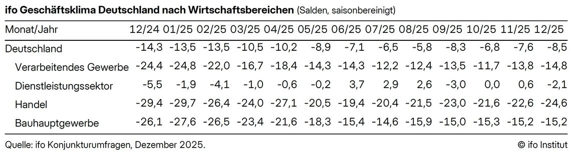 Im Dienstleistungssektor sank das Geschäftsklima wieder in den negativen Bereich. Die Dienstleister zeigten sich mit den laufenden Geschäften unzufriedener. Auch ihre Erwartungen sanken. Positive Ausnahme einzig die Gastronomie, die von einem starken Beginn im Dezember berichtete.