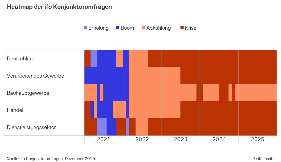 Die ifo-Heatmap bietet eine verdichtete Darstellung der ifo-Konjunkturuhr für die verschiedenen Branchen. Dunkelrot markiert eine unterdurchschnittliche Lage und Erwartung – ein Krisensignal. Hellblau steht für Erholung, dunkelblau für Boom- oder Überhitzungsphasen. Ein hellroter Farbton weist hingegen auf eine Abkühlung mit sinkenden Erwartungen hin.