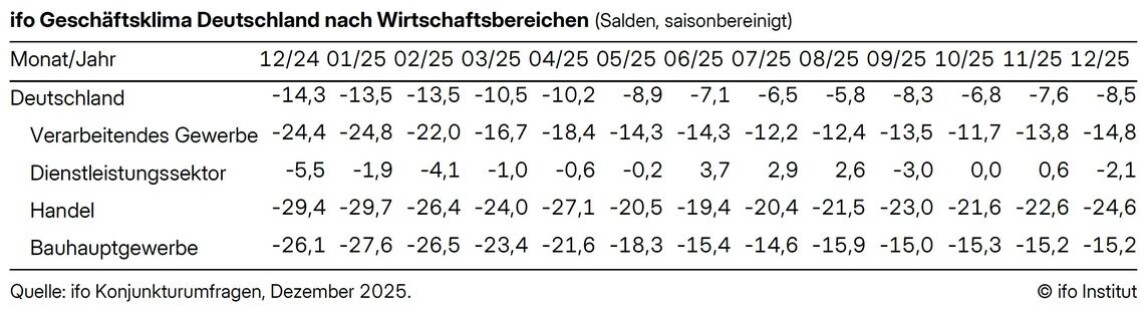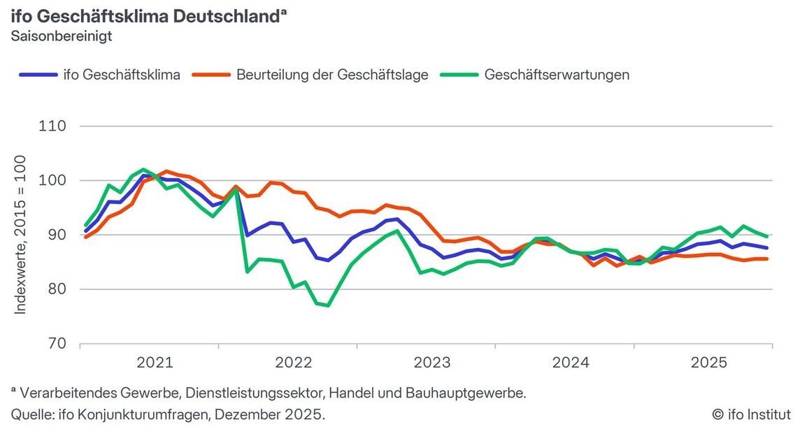(17.12.2025) Der ifo Geschäftsklimaindex sank im Dezember 2025 auf 87,6 Punkte, nach 88,0 Punkten im November. Die Unternehmen blicken pessimistischer auf das kommende Halbjahr 2026. Der Indikator zur aktuellen Lage blieb unverändert. Insgesamt endet das Jahr 2025 ohne Aufbruchstimmung.