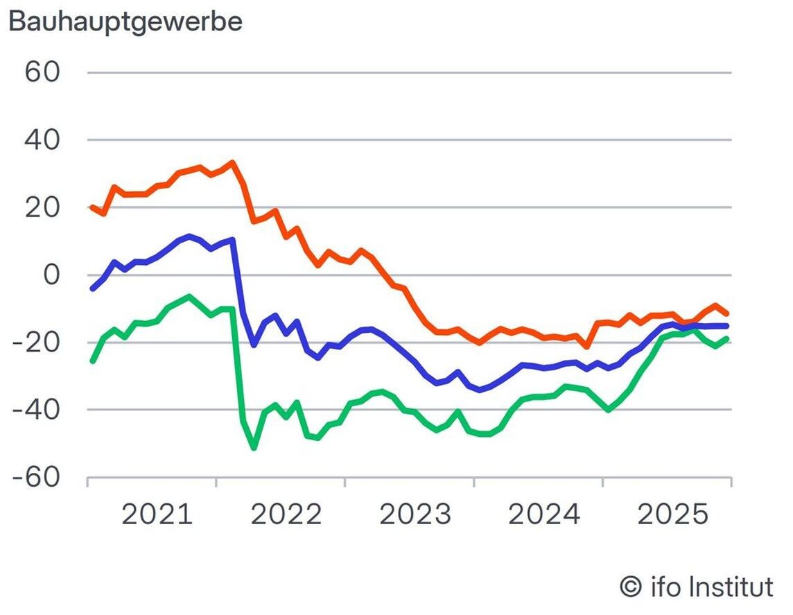 Im Bauhauptgewerbe bleibt der Index unverändert auf niedrigem Niveau. Die Unternehmen beurteilen die aktuelle Lage schlechter, blicken dafür aber weniger skeptisch auf die kommenden Monate.