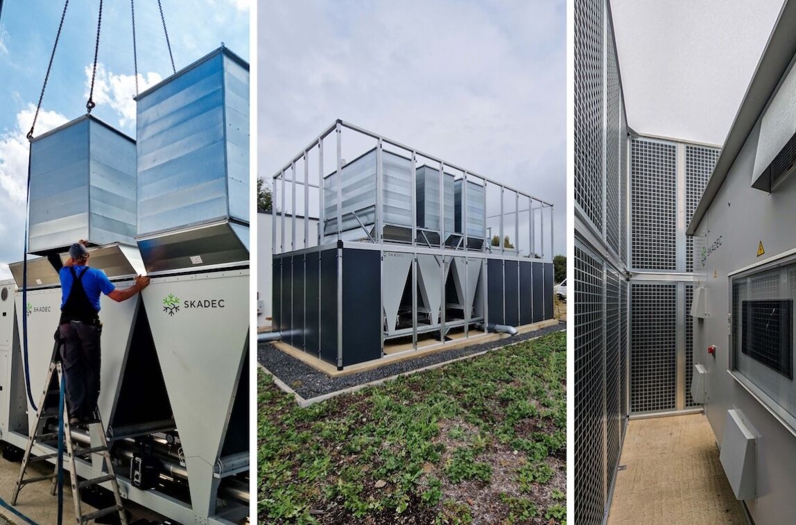 Die nach oben offene Einhausung misst 7.800 x 3.925 x 4.200 mm und hat ein Gesamtgewicht von etwa 3.000 kg. Sie reduziert die Schallemissionen um weitere 20 dB(A) und sorgt gleichzeitig für ein ruhiges Erscheinungsbild der Installation. Durch die Kombination beider Schallschutzstufen konnte der überwiegende Anteil der Betriebsgeräusche wirksam abgeschirmt werden, ohne die Zugänglichkeit der Wärmepumpe zu beeinträchtigen.